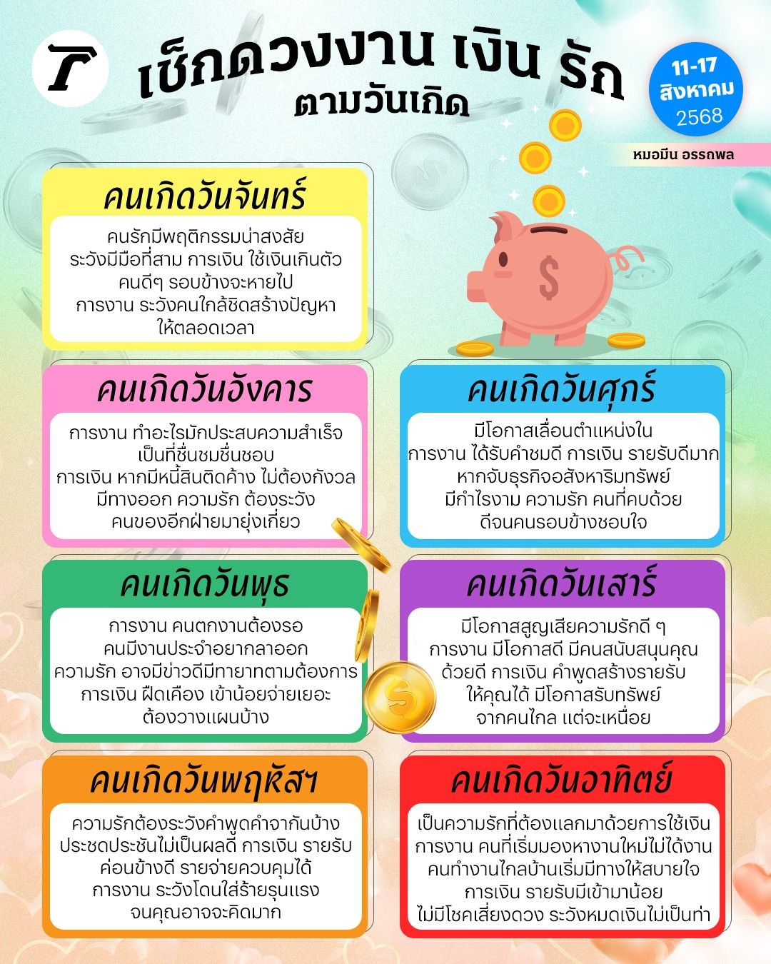 ดูดวงรายสัปดาห์ตามวันเกิด 11-17 สิงหาคม 2568 หมอมีน อรรถพล ดวงการงาน การเงิน ความรัก วิธีเสริมดวง และเลขเด็ด