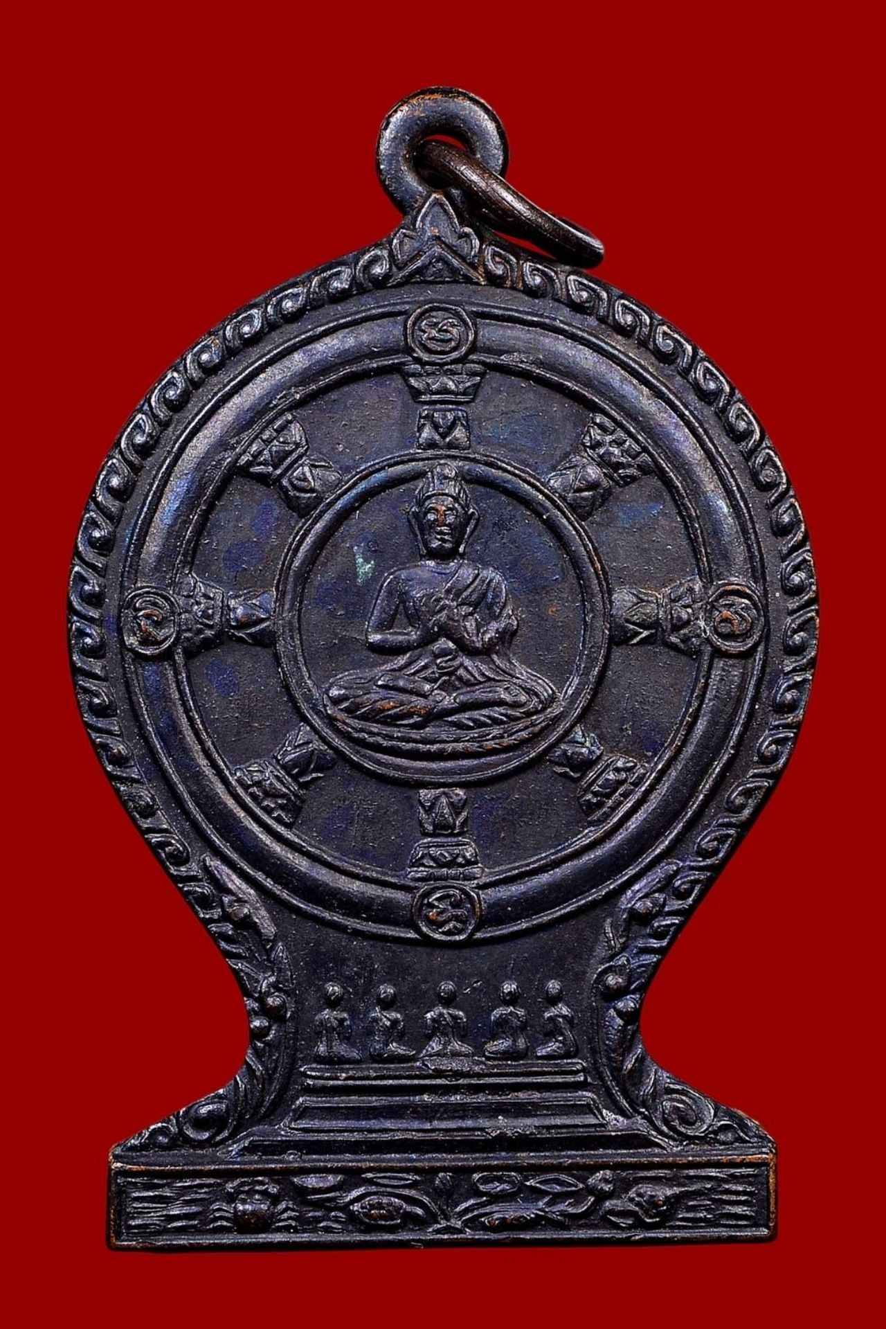 ด้านล่างเป็นพระปัญจวัคคีย์นั่งพนมมือหันหลังให้ ขอบเหรียญเป็นลายกนก ล่างสุดเป็นรูปสระบัว อันหมายถึงบัวสี่เหล่าตามพุทธดำรัส ส่วนด้านหลัง ตรงกลางเป็นรูปเหมือนหลวงพ่อลีครึ่งองค์ ห่มจีวรลดไหล่ อยู่ในวงกลมเล็ก มีรัศมีกระจายโดยรอบ ล้อมด้วยวงกลมใหญ่อีกชั้นหนึ่ง รอบเหรียญมีอักษรไทยว่า "ที่ระลึกงานผูกพัทธสีมา วัดอโศการาม วิสาขฤกษ์ ๒๕๐๓" และมีอักขระขอมพร้อมตัว "อุ" ปิดหัวท้าย บริเวณใต้ฐานเหรียญเขียนคำว่า "พระอาจารย์ลี เจ้าอาวาส วัดอโศการาม"