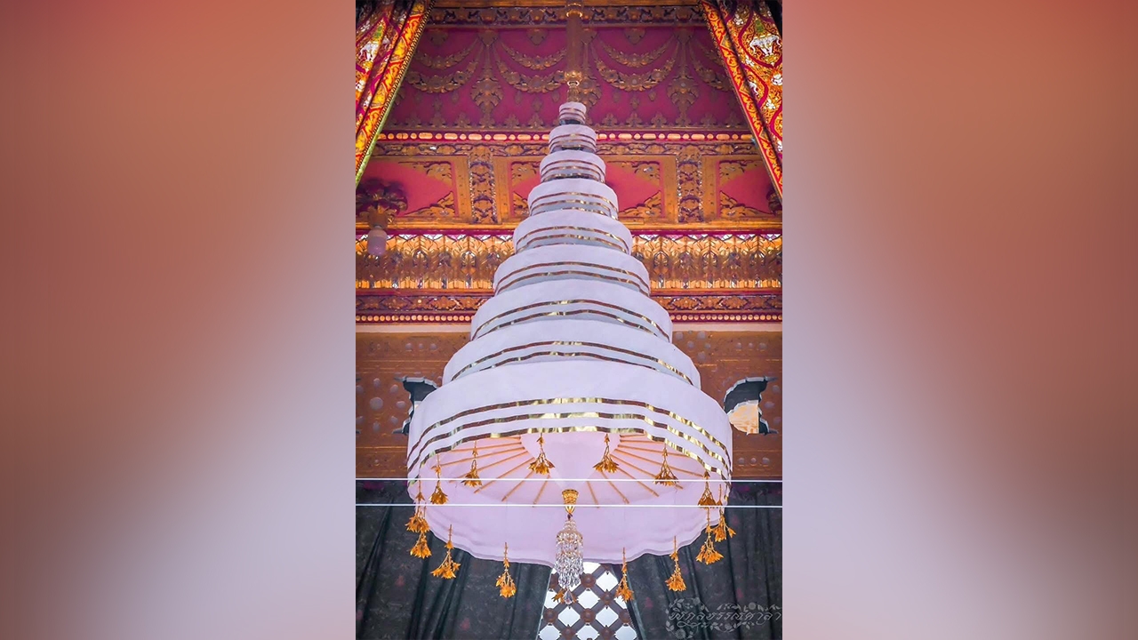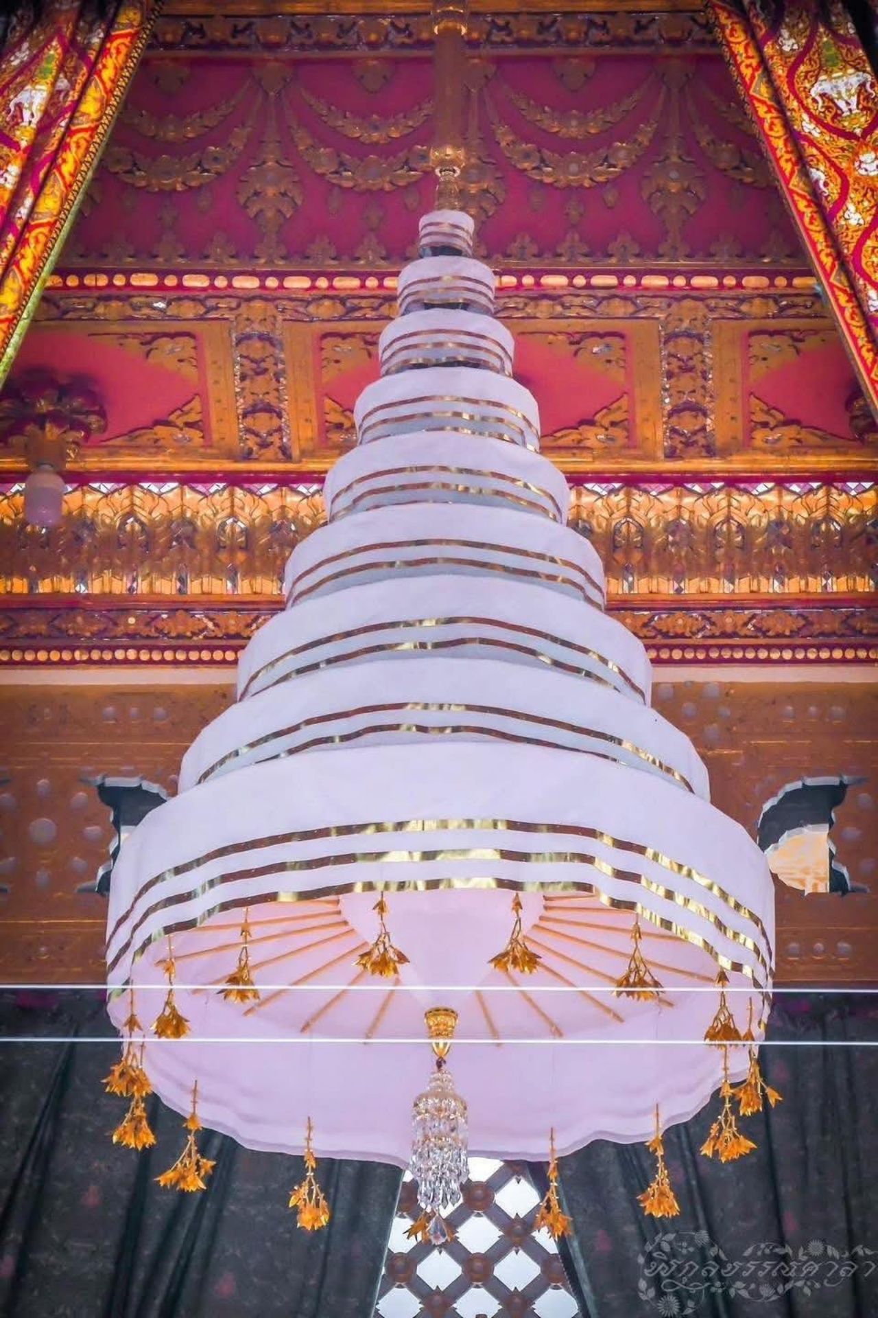 - เป็นฉัตร 9 ชั้น ทำด้วยผ้าขาว มีระบายขลิบทองแผ่ลวดซ้อนกัน 3 ชั้น ห้อยอุบะจำปาทอง