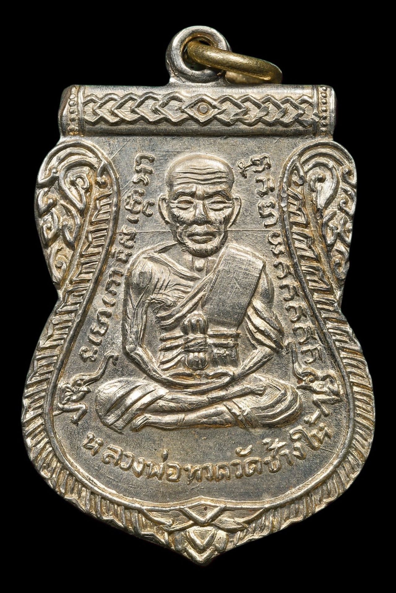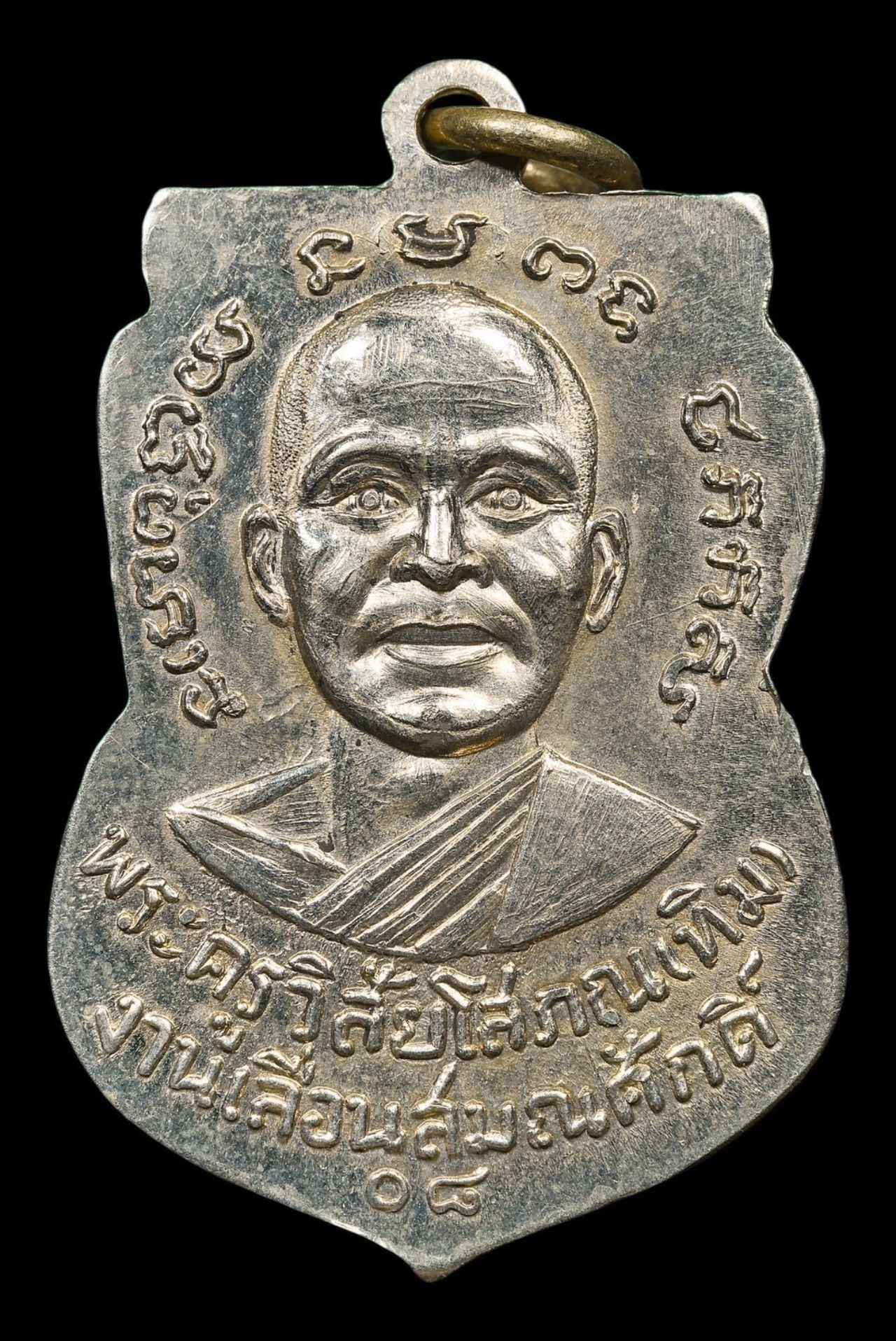 ด้านหนึ่งเป็นรูปหลวงปู่ทวดนั่งขัดสมาธิ มีอักษรอักขระรอบข้าง มีรูปช้างที่ด้านข้างทั้งสองฝั่ง ที่บริเวณฐานมีอักษรคำว่า "หลวงพ่อทวด วัดช้างให้" มีห่วงในตัว ส่วนอีกด้านหนึ่งมีรูปหลวงปู่ทิมครึ่งองค์หน้าตรง มีอักษรอักขระรอบข้าง และมีอักษรภาษาไทยคำว่า พระครูวิสัยโสภณ (ทิม) งานเลื่อนสมณศักดิ์ 08