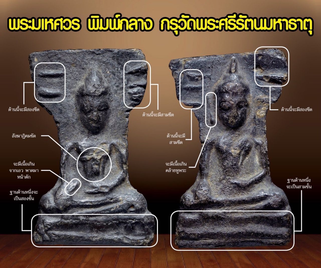พระ“มเหศวร”นับเป็นพระเครื่องชั้นนำซึ่งพบในกรุพระปรางค์วัดพระศรีรัตนมหาธาตุเมื่อพ.ศ. 2456 รวมอยู่กับพระผงสุพรรณในครั้งนั้นด้วยครับ จากพิมพ์ที่ช่างอู่ทองได้ให้จินตนาการไว้กับพระมเหศวรนี้ นับเป็นปฏิบัติการที่ค่อนข้างพิสดารและยอดเยี่ยมกว่าพระเครื่องที่พบในเมืองสุพรรณทั้งหมดครับ โดยสร้างไว้ชนิดชินเงินผิวกลับดำตีนกาและบางองค์ก็มีผิวปรอดจับอยู่ด้วยครับ มีพิมพ์ที่แตกต่างกันออกไปอีกถึง 4 พิมพ์ด้วยกันครับ คือ