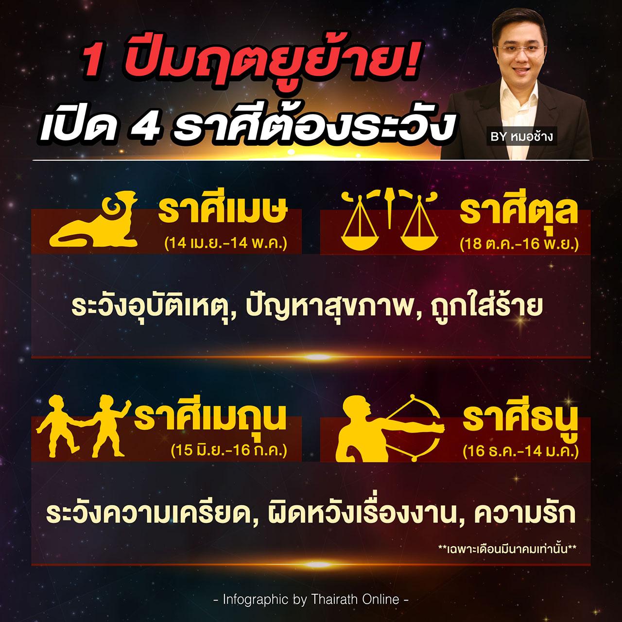 หมอช้าง ทศพร ศรีตุลา หมอดูชื่อดัง เจ้าของฉายาจอมเก็บสถิติกล่าวเตือนผ่านไทยรัฐออนไลน์ที่แรกว่า เดือนมีนาคม 2560 นี้ มี 2 เหตุการณ์สำคัญที่ต้องระวัง 1.เดือนมีนาคมนี้ครบรอบ 1 ปีดาวมฤตยูย้าย ซึ่งดาวมฤตยูจะอยู่ตรงนี้นานอีก 6 ปี และ 2.วันที่ 12 มีนาคมนี้จะมีดวงดาวใหญ่โคจรผิดปกติเยอะมาก ส่งผลให้ภาพใหญ่เกิดเหตุการณ์น่ากลัวมากมาย เช่น แผ่นดินไหว ภัยธรรมชาติ อุบัติเหตุใหญ่จากขนส่งสาธารณะ รวมทั้งผู้ที่เกิด 4 ราศีต้องระวังตัวให้มากจะมีเรื่องร้ายๆ ในเดือนมีนาคมนี้ต้องระวัง