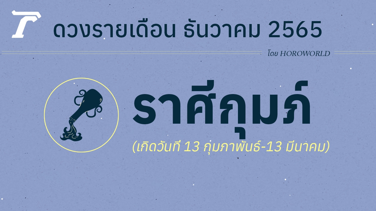 เผยคำทำนายส่งท้ายปลายปี เดือนธันวาคม 2565 by Horoworld ทั้งดวงการงาน การเงิน ความรัก สุขภาพ โชคลาภ ข้อควรระวัง และเคล็ดลับเสริมดวง ชาวราศีกุมภ์ช่วงนี้เน้นให้เก็บออม ไม่เน้นลงทุน สิ่งที่หวังเรื่องงานจะสำเร็จ ระวังอาการวิตกจริตคิดมากจะทวีคูณเพิ่มขึ้นเรื่อยๆ จนอาจจะส่งผลเสียต่อสุขภาพร่างกายอย่างหนัก ควรปล่อยวางและไม่คิดมากเกินไป ควรหมั่นทำบุญอุทิศส่วนกุศล กรวดน้ำให้เจ้ากรรมนายเวร เพื่อเสริมดวงชะตาให้มีสติรอบคอบและแก้ปัญหาต่างๆ ให้คลี่คลายในทางที่ดี