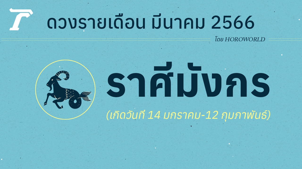 เปิดดวงชะตา ประจำเดือนมีนาคม 2566 โดย Horoworld ความวุ่นวายไม่ลงตัวในช่วงก่อนหน้านี้ยังคงดำเนินมาถึงปัจจุบัน จะส่งผลให้ชาวราศีมังกร เกิดความเครียดอย่างหนักจนล้มป่วยไม่สบายมาก ควรทำบุญโลงศพ ผ้าขาวห่อศพ และช่วยเหลือศพไร้ญาติ เสริมดวงชะตาเพื่อลดทอนเคราะห์กรรมความวุ่นวายให้ลดน้อยลงไป