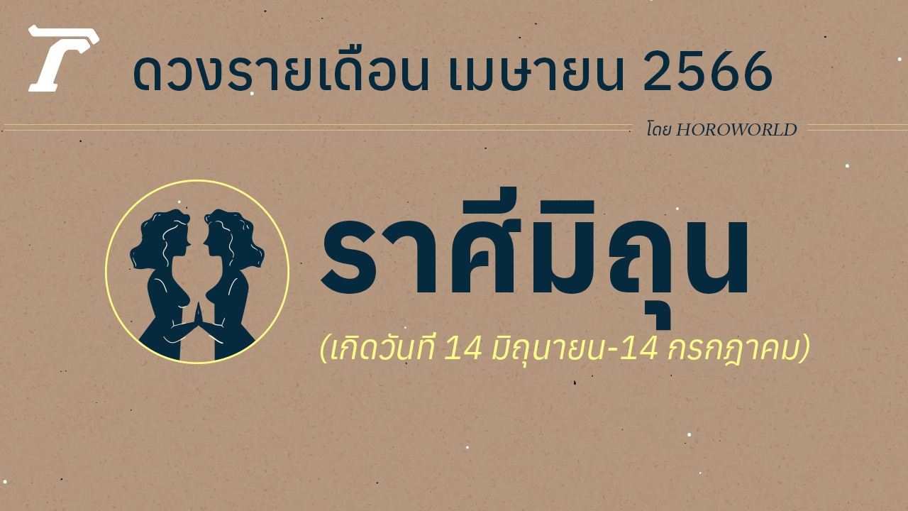 ต้อนรับเดือนปีใหม่ไทย เปิดดวงชะตา ประจำเดือนเมษายน 2566 โดย HoroWorld เดือนนี้ราศีเมถุน จำเป็นจะต้องมีสติและระวังจิตใจของตนเองให้สงบนิ่ง หากใจว้าวุ่นกับความรักมากเกินไปจะก่อให้เกิดความทุกข์ทั้งตนเองและคนอื่น ควรไปไหว้สักการะขอพระตรีมูรติ และทำบุญช่วยเหลือผู้ป่วยโรคหัวใจ เสริมดวงชะตาเพื่อให้มีจิตใจที่มั่นคงเข้มแข็งและมีความรักที่ดี