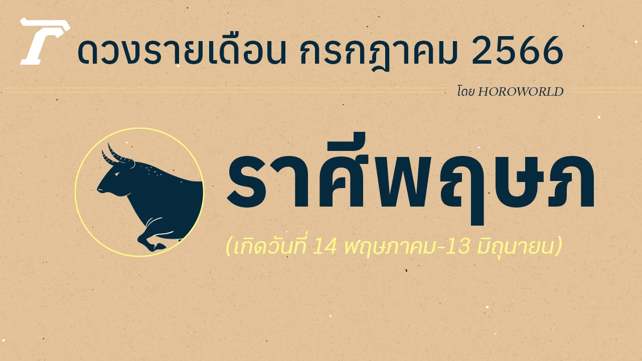 เปิดดวงชะตาประจำเดือนกรกฎาคม 2566 โดย Horoworld ช่วงนี้ชาวราศีพฤษภ ควรใส่ใจอารมณ์ความรู้สึกของตนเองให้มากขึ้นและทำจิตใจให้นิ่ง ไม่ควรปล่อยใจให้ว้าวุ่นไปตามลมปากของคนอื่นมากจนเกินไป จะเกิดผลเสียในอนาคตได้ ควรจุดเทียนหอมอโรมาสีแดงในทิศตะวันตกเฉียงใต้ของบ้าน เสริมดวงชะตาเพื่อให้มีจิตใจที่สงบเบิกบานและมีมิตรสหายที่ดี