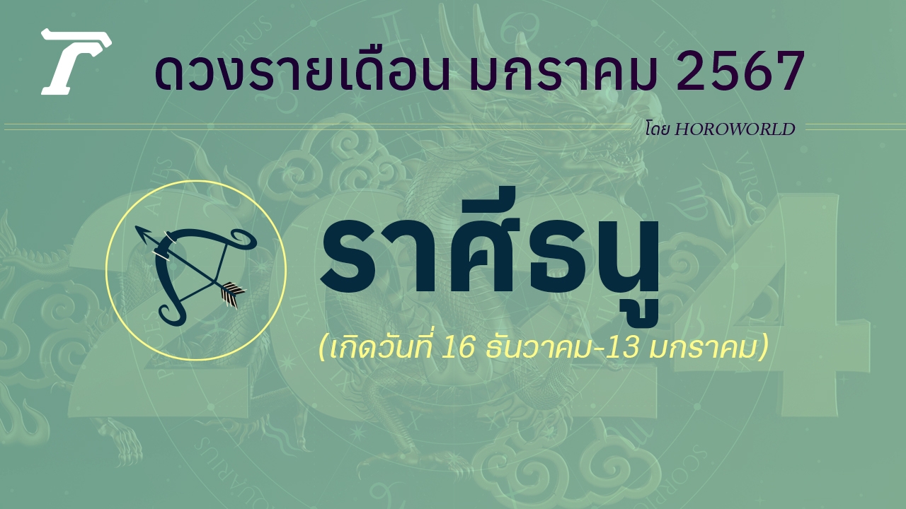 มาเช็กดวงชะตา จัดเต็ม 12 ราศี เดือนมกราคม 2567 ภาพรวมชาวราศีธนูช่วงนี้ อยู่ในด้านดี ทำมากยิ่งได้มาก มีรายได้เข้ามาเรื่อยๆ มีเกณฑ์ประสบความสำเร็จในไม่ช้า ความแน่วแน่เข้มงวดมีทั้งดี ไม่ดี ขึ้นกับสถานการณ์ และคนที่เกี่ยวข้อง ทำให้พอเหมาะจึงจะให้ผลดี เด็ดขาดในสิ่งที่ควร ปัญญาจะช่วยให้สำเร็จ เคล็ดลับเสริมดวง ไหว้พระ ปิดทองพระประจำวันเกิด ปฏิบัติธรรม ทำบุญถวายดิน ที่ดิน สิ่งก่อสร้าง น้ำ เสริมความมั่งคั่ง มั่นคง