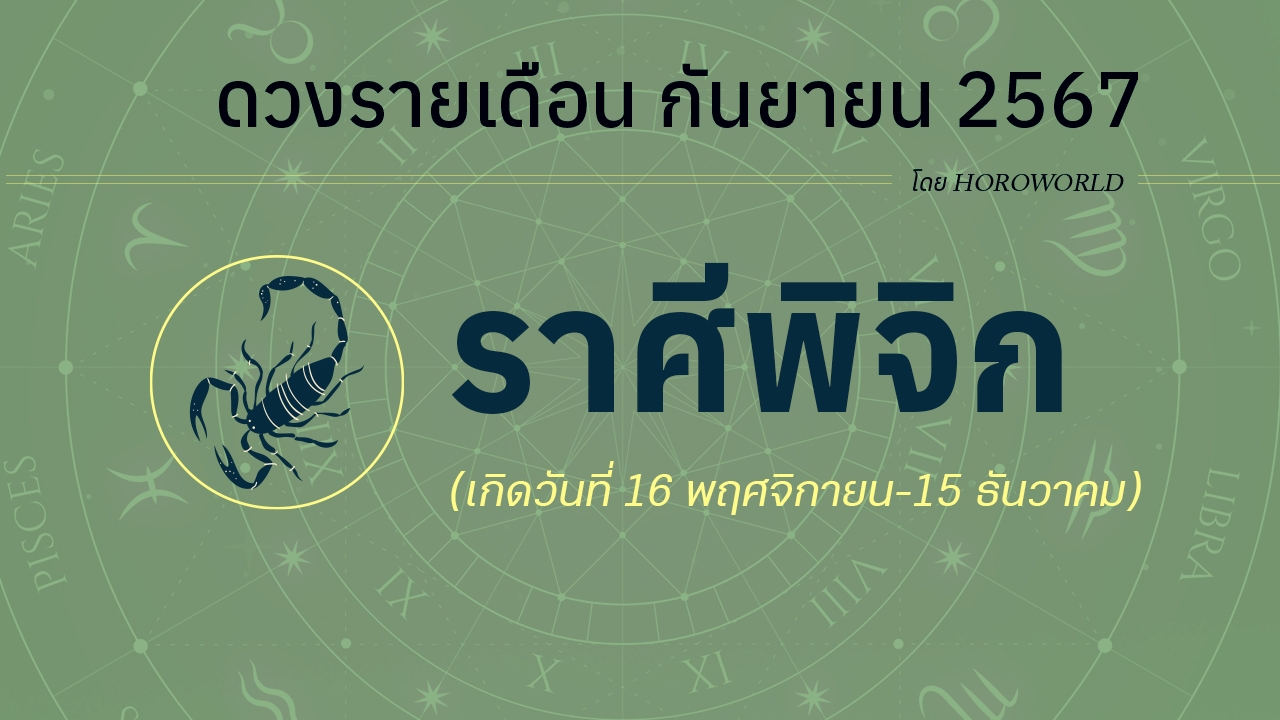 เปิดดวงชะตา เดือนกันยายน 2567 โดย Horoworld ดวงการงาน การเงิน ความรัก โชคลาภ สุขภาพ ข้อควรระวัง และเคล็ดลับเสริมดวง เดือนนี้ชาวราศีพิจิกยิ้มได้สักที ดวงมีการเปลี่ยนแปลง งานเข้ามาไม่ขาดมือ ยิ่งขยันยิ่งได้เงิน แต่ระวังคนอื่นอาจจะนำปัญหามาให้ เสียเงินเพราะความใจอ่อน ถูกหลอกได้ง่าย ความแน่นอนคือความไม่แน่นอน ผู้เลื่อนไหลตามสถานการณ์ได้จะรอด แต่ดวงนี้มีผู้อุปถัมภ์ค้ำจุน