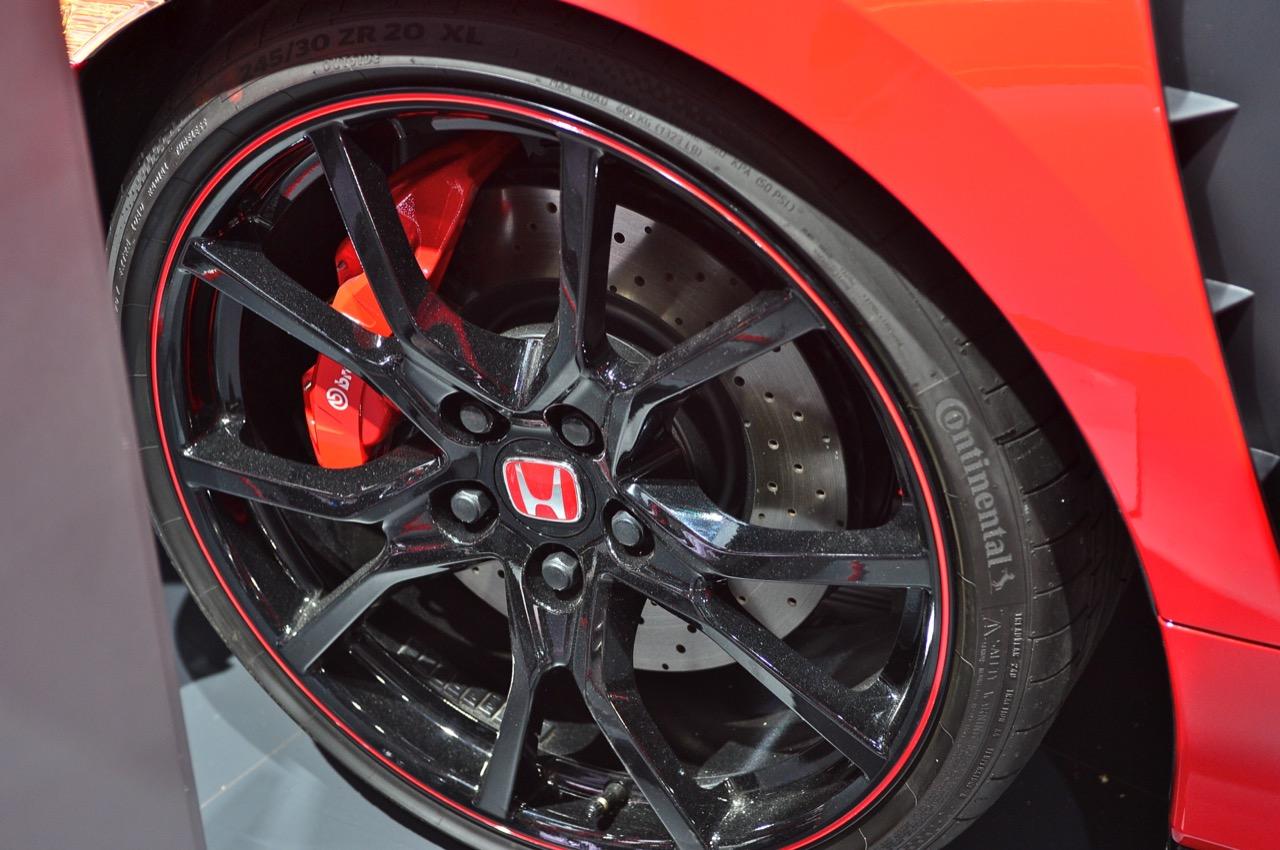 Honda Civic Type R ยัดล้อลายก้านขนาด 20 นิ้ว เกิดจากการขยายแพลตฟอร์มให้กว้างขึ้น 30 มิลลิเมตร ยางล้อหน้าและหลังไซส์ 245/30ZR20 XL เป็นยางสปอร์ตจากค่ายยางเยอรมนียี่ห้อ Continental รุ่น Sport Contact 6 แก้มข้างด้านหน้าพร้อมโป่งซุ้มล้อที่อวบขึ้น เกิดจากการขยับขยายระยะห่างระหว่างล้อหน้ากับช่องระบายความร้อนสำหรับเป่าลมเย็นๆ ใส่จานเบรก เบรกจาก Brembo เป็นแบบ 4 พอตหน้า 2 พอตหลังเหมือนเดิม จานเบรกเจาะรูระบายก็ยังเหมือนเดิม แต่ไม่มีออปชั่นเบรกคาร์บอนเซรามิก เนื่องจากไม่ได้มีแรงม้าท่วมท้นแบบซุปเปอร์คาร์ จึงไม่มีความจำเป็นจะต้องใช้เบรกเทพราคาแพงแบบนั้น