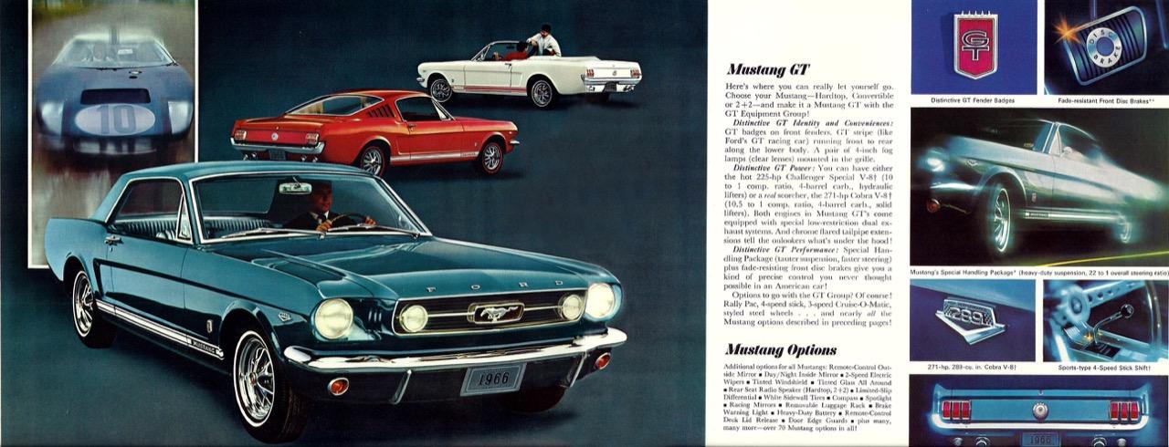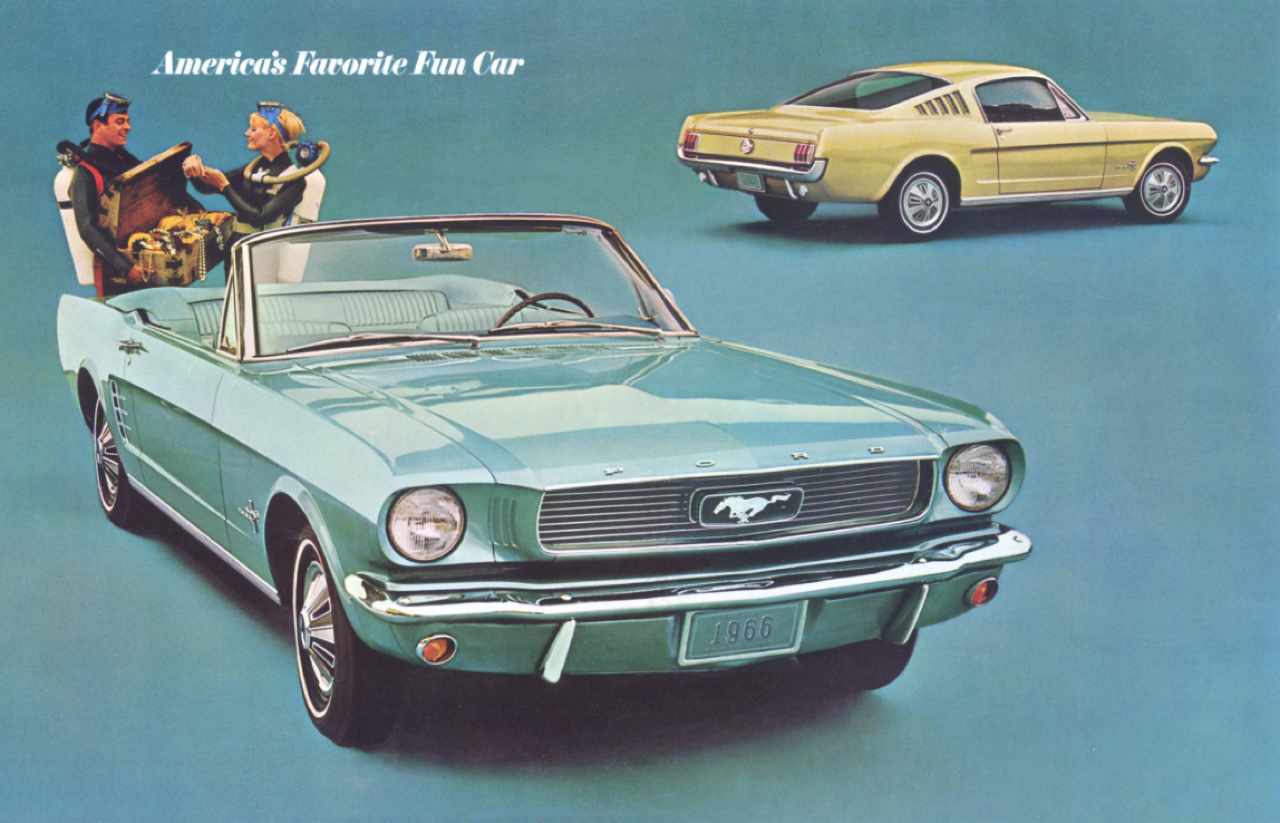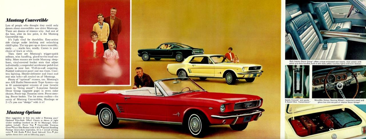 ตลอดช่วง 50 ปีที่ผ่านมา วงการโฆษณาเกี่ยวกับรถยนต์มีวิวัฒนาการและความเปลี่ยนแปลงอย่างต่อเนื่องหลายยุคสมัย เห็นได้จากโฆษณาใบปลิวในสมัยแรกๆ ของ Ford Mustang สำหรับผู้บริหารฝ่ายโฆษณาแล้ว การขาย Mustang รุ่นแรก ไม่ใช่เรื่องยาก เพราะ Mustang เป็นรถสปอร์ตขนาดกะทัดรัดพร้อมประสิทธิภาพความทนทาน มาพร้อมราคาที่คนทั่วไปสามารถซื้อหาได้ แถมยังมีตัวเลือกในการตกแต่งที่หลากหลาย ทำให้ Mustang เป็นรถที่โดนใจลูกค้าในยุคกลางทศวรรษ 1960