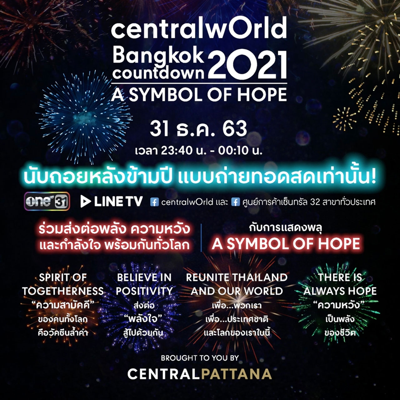 ร่วมกันรับชม LIVE และเคาต์ดาวน์จากบ้านไปกับ “Central World Bangkok Countdown 2021 – A Symbol of Hope” ได้พร้อมกัน ตั้งแต่ 23:40-00:10 น. ผ่านไลฟ์สดช่อง ONE 31 และ LINE TV เท่านั้น
