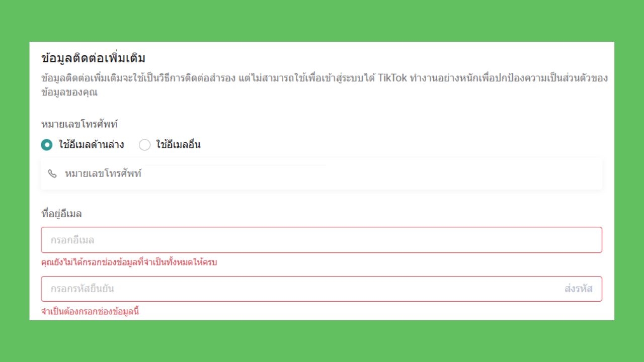 6. กรอกข้อมูลเพิ่มเติมสำหรับวิธีติดต่อสำรอง โดยกรอกข้อมูลอีเมล หลังจากนั้นคลิกยอมรับข้อกำหนดและเงื่อนไขของ TikTok พร้อมคลิก "ส่ง" เพื่อส่งข้อมูลให้ TikTok และรอการอนุมัติกลับมา