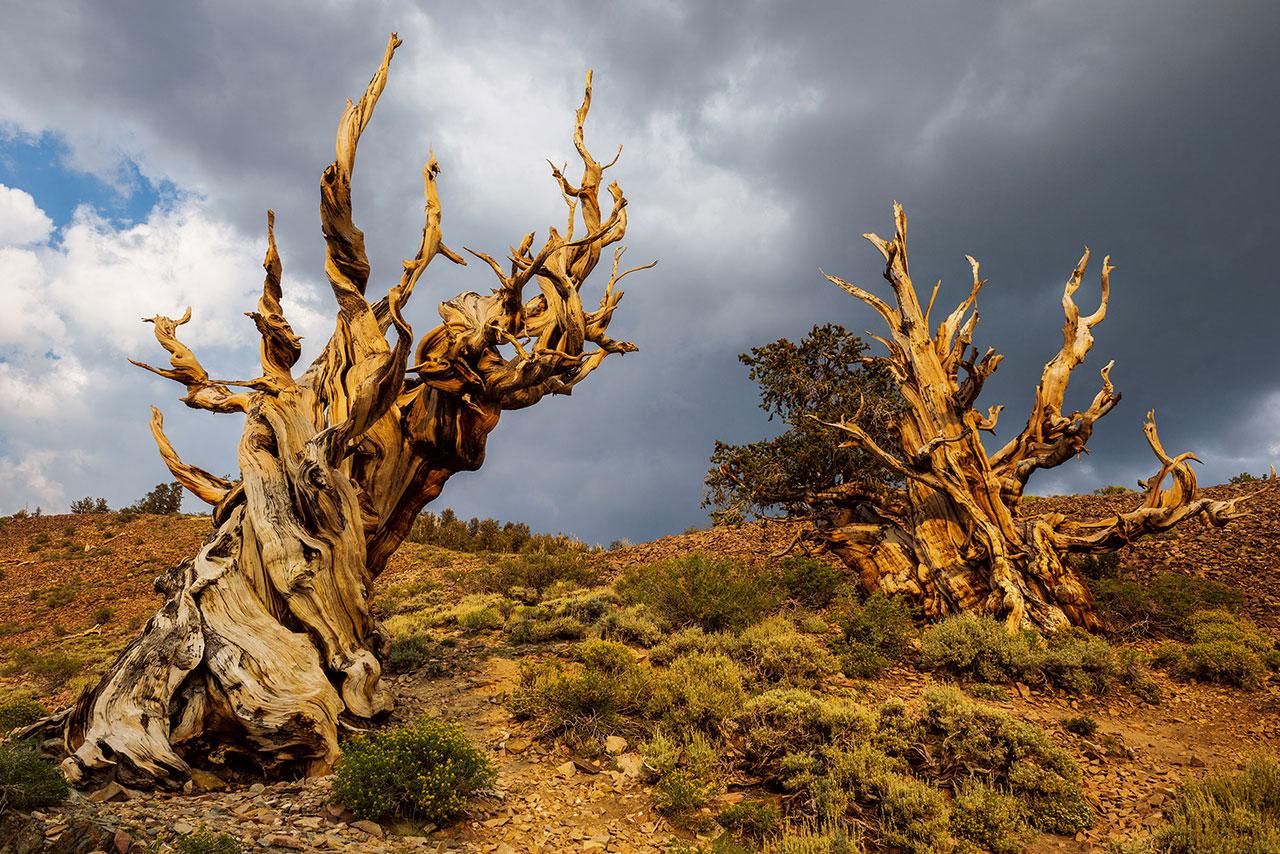 ต้นสนบริสเซิลโคนไพน์, ป่าแห่งชาติอินโย, แคลิฟอร์เนีย - เอดมันด์ ชุลแมน นักวิทยาศาสตร์ ใช้เวลาช่วงฤดูร้อนหลายปีในภูมิภาคแถบตะวันตกของสหรัฐฯ เพื่อเสาะหาตัวอย่างต้นไม้อายุมากที่สุดที่ยังยืนต้นอยู่ เขาพบตัวอย่างเหล่านั้นในหมู่สนบริสเซิลโคนไพน์ที่ลำต้นหงิกงอและไม่สูงนัก เมื่อปี 1957 ชุลแมนค้นพบเมทูเซลาห์ สนบริสเซิลโคนไพน์ที่มีวงปี 4,789 วง นับเป็นต้นไม้โบราณที่ยังยืนต้นอยู่