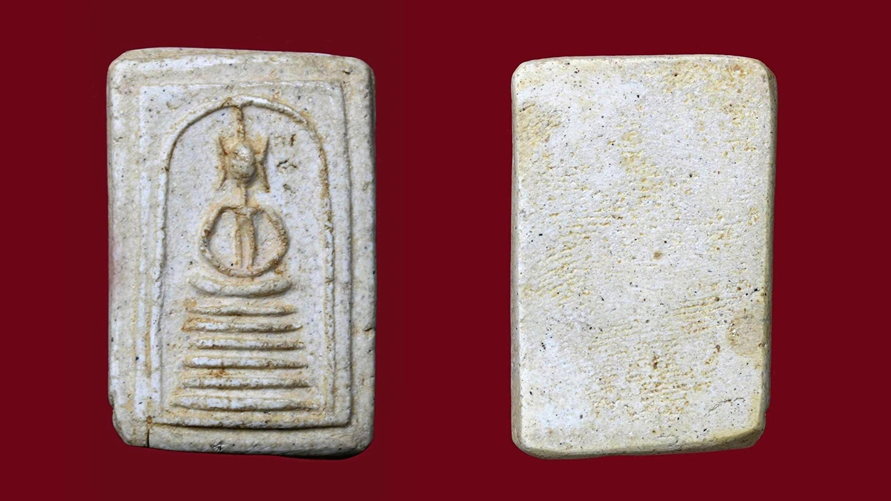 ค้นพบคราวสงครามอินโดจีน โดยท่านเจ้าคุณพระคุณาจารวัตร ส่วนใหญ่เป็นพระเนื้อผงพุทธคุณรูปแบบต่างๆมากมายหลายพิมพ์ มีพบที่เป็น เนื้อตะกั่วลงถม (แผ่นตะกั่วลงยันต์ปลุกเสกลบถม ๑๐๘ รอบ) แบบองค์นี้ ของ ดร.ณัฐธัญ มณีรัตน์ ลักษณะเป็นพระพิมพ์พุทธศิลป์สมัยรัตนโกสินทร์ องค์พระประทับนั่งปางมารวิชัยเหนือฐานผ้าทิพย์ รูปทรงกลีบบัว แบบเดียวกับชนิดเนื้อผง แจกทหารเข้าร่วมรบในสงครามอินโดจีน