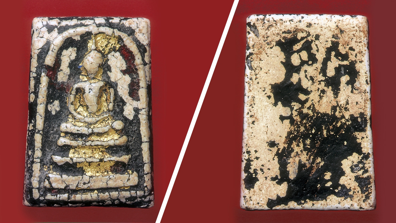 ในพื้นผนังแผ่นรักดำ หลุดร่อนไปบางส่วน ส่องดูเนื้อขุ่นขาวนุ่มซึ้งได้สบาย อย่าลืมแผ่นรักที่จมฝังในรอยลายงาบางๆ ซึ่งก็คือธรรมชาติของสมเด็จวัดระฆังแท้อีกประการ