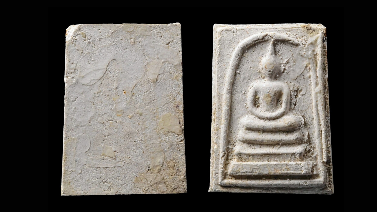 ลักษณะเป็นพระพิมพ์รูปทรงห้าเหลี่ยม ด้านหน้าเป็นองค์พระนั่งพุทธศิลป์สมัยอยุธยา ด้านหลังเรียบ เนื้อดินเผาหยาบปนเม็ดกรวดทราย สีเนื้อเหลือง แดง เขียว น้ำตาล