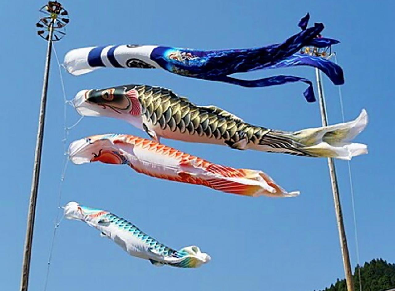 โดยธงปลาคาร์ปสีดำหมายถึงปลาพ่อ “มาโงย”...ปลาคาร์ปสีแดงคือปลาแม่ “ฮิโงย” ...ปลาคาร์ปสีฟ้าหมายถึงลูก ต่างพากันปลิวไสวไปตามแรงลม ราวว่ายแหวกสู่เป้าหมายคือประตูมังกร...เปรียบได้เช่นปลาคาร์ปกำลังแสดงปาฏิหาริย์นำบุตรหลานไปสู่ความสำเร็จในชีวิต