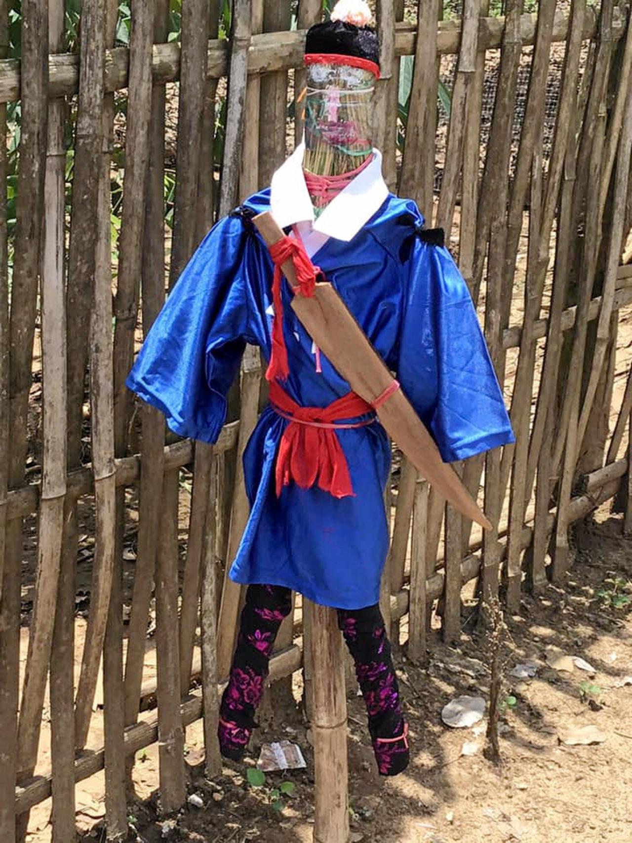 ถนนในหมู่บ้านตัดลัดเลาะไปตามรั้วของบ้านจึงไม่เป็นระเบียบมีดินแดงๆที่เป็นสันตามร่องน้ำ ดูแล้วก็เป็นบ้านชนบทที่เงียบสงบ...เข้าปากทางหมู่บ้านมีคนทำ “หุ่นปลอม” มาตั้งไว้หน้าบ้าน...ฉันเดาว่าน่าจะเอาไว้ไล่ “สิ่งชั่วร้าย” ซึ่งตอนนี้ก็น่าจะหมายถึง “ไวรัสโควิด” ตัวร้ายที่เข้ามาคุกคามชีวิตเรียบง่ายของพวกเขา