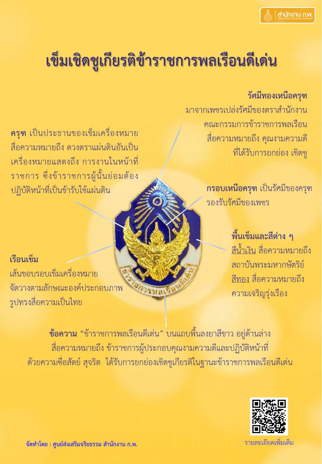 ผู้ที่ได้รับคัดเลือกเป็นข้าราชการพลเรือนดีเด่น จะได้รับเข็มเชิดชูเกียรติสลักคำว่า “ข้าราชการพลเรือนดีเด่น” บนพื้นหลังสีขาว แสดงความหมายถึงข้าราชการผู้ประกอบคุณงามความดีและปฏิบัติหน้าที่ด้วยความซื่อสัตย์ สุจริต ได้รับการยกย่องเชิดชูเกียรติในฐานะข้าราชการพลเรือนดีเด่น