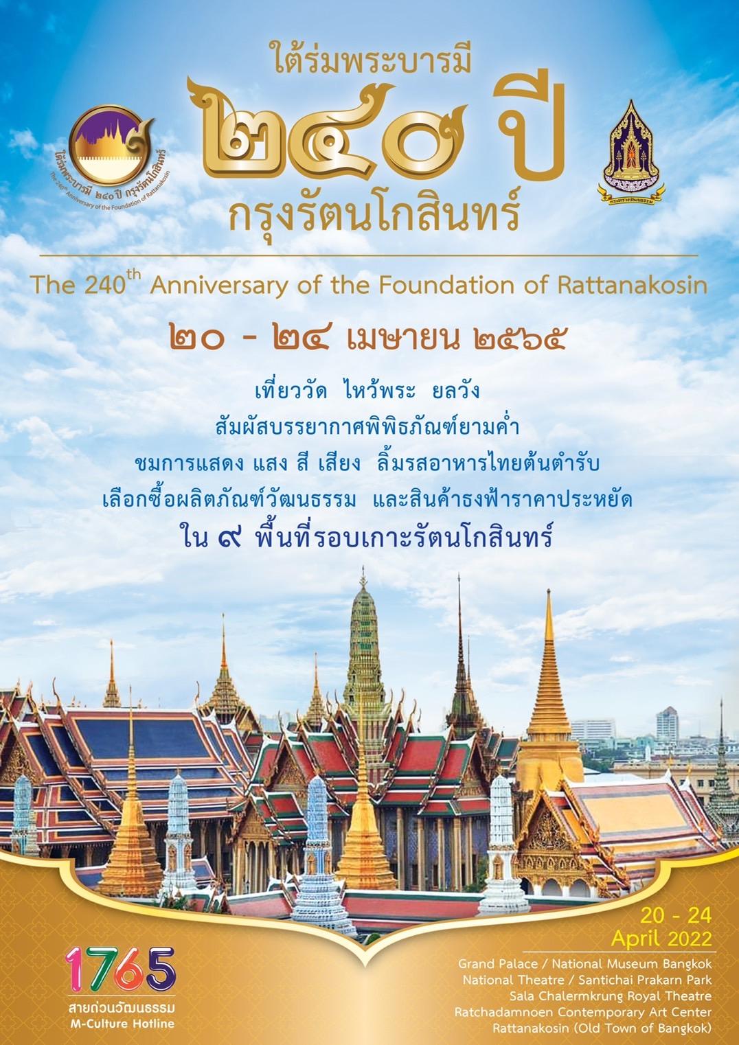 การจัดกิจกรรมฉลองกรุงรัตนโกสินทร์ 240 ในปี พ.ศ. 2565 มีชื่อว่า “ใต้ร่มพระบารมี 240 ปี กรุงรัตนโกสินทร์” (The 240th Anniversary of the Foundation of Rattanakosin)