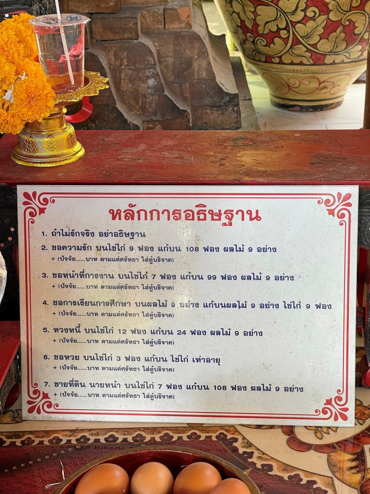 สี่...ขอการเรียนการศึกษา บนผลไม้ 9 อย่าง แก้บนผลไม้ 9 อย่าง ไข่ไก่ 9 ฟอง ห้า...ทวงหนี้ บนไข่ไก่ 12 ฟอง แก้บน 24 ฟอง ผลไม้ 9 อย่าง หก...ขอหวย บนไข่ไก่ 3 ฟอง แก้บนไข่ไก่เท่าอายุ เจ็ด...ขายที่ดิน นายหน้า บนไข่ไก่ 7 ฟอง แก้บน 108 ฟอง ผลไม้ 9 อย่าง
