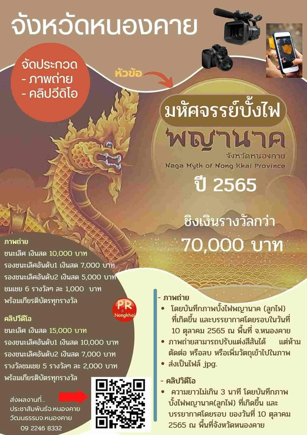 งานบั้งไฟพญานาคจังหวัดหนองคาย ปี 2565 มีชื่อว่า งานประเพณีออกพรรษาและบั้งไฟพญานาคโลก ประจำปี 2565 เริ่มวันที่ 7-13 ตุลาคม 2565 และมีการจัดประกวดถ่ายภาพในหัวข้อ “มหัศจรรย์บั้งไฟพญานาค”