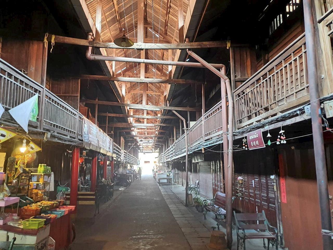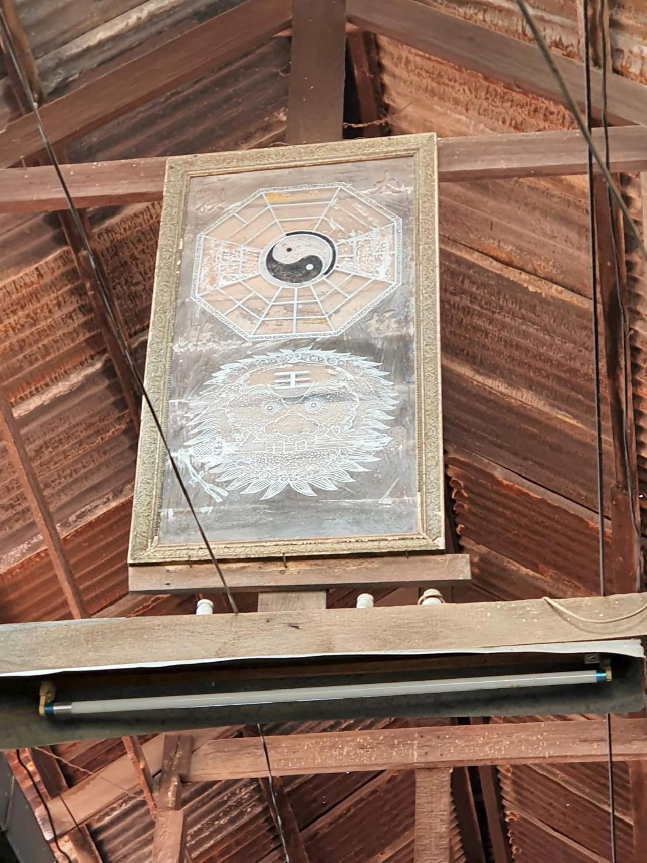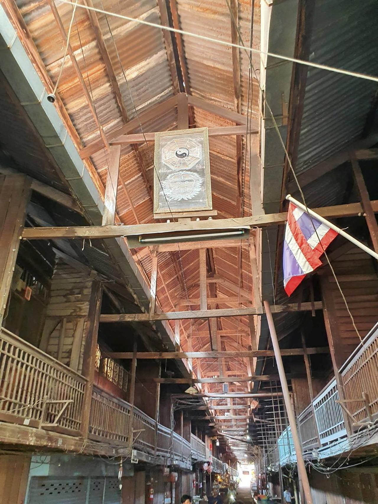 “ฮู้ใหญ่โบราณ” ติดไว้ให้เห็นชัดเจนบนขื่อหลังคาในตลาดเก้าห้อง
