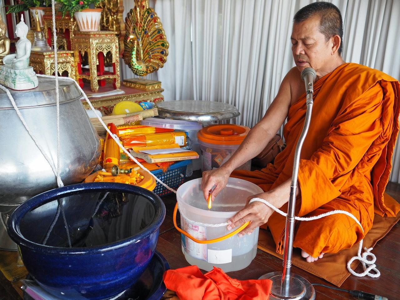 เริ่มจาก...นำน้ำใส่ภาชนะวางกลางแจ้ง ให้แสงจันทร์สัมผัสผิวน้ำได้ เมื่อถึงเวลาที่พระจันทร์อยู่ตำแหน่งสูงสุด...กลางกระหม่อม เงาสะท้อนพระจันทร์ปรากฏในภาชนะบรรจุน้ำ หมายว่า...ได้ซึมซับพลังจันทร์ก่อเกิดพลังอำนาจอย่างสูงสุด
