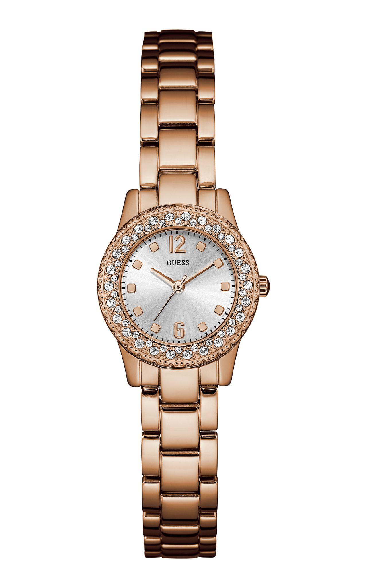 รุ่น DIXIE สี Rose Gold ตัวเรือนและสาย Stainless Steel Rose Gold tone, Top ring ประดับด้วย Crystal ให้ความรู้สึกหรูหรา และโดดเด่น สะท้อนความเป็น Guess Girl ให้ความเป็นผู้ใหญ่ หรือลุคที่ต้องการความเป็นทางการหน่อยๆ ด้วยสายที่เป็น Stainless ก็คอมพรีทลุคของคุณให้สวยได้ในทุกวัน