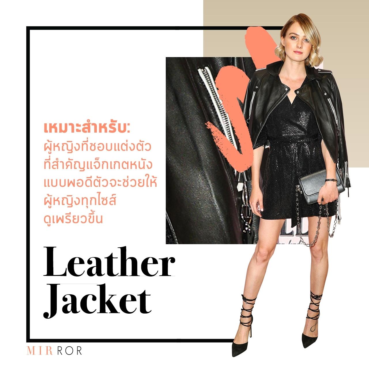 เหมาะสำหรับ: ผู้หญิงที่ชอบแต่งตัวหน่อย เพราะต้องใช้ความกล้าและท้าทายต่อเสียงคอมเมนต์จากคนรอบตัว แต่ไม่เชื่อก็ต้องเชื่อว่าแจ็กเกตหนังทรงสวยๆ แบบพอดีตัวจะช่วยให้ผู้หญิงทุกไซส์ดูเพรียวขึ้นอย่างไม่น่าเชื่อ