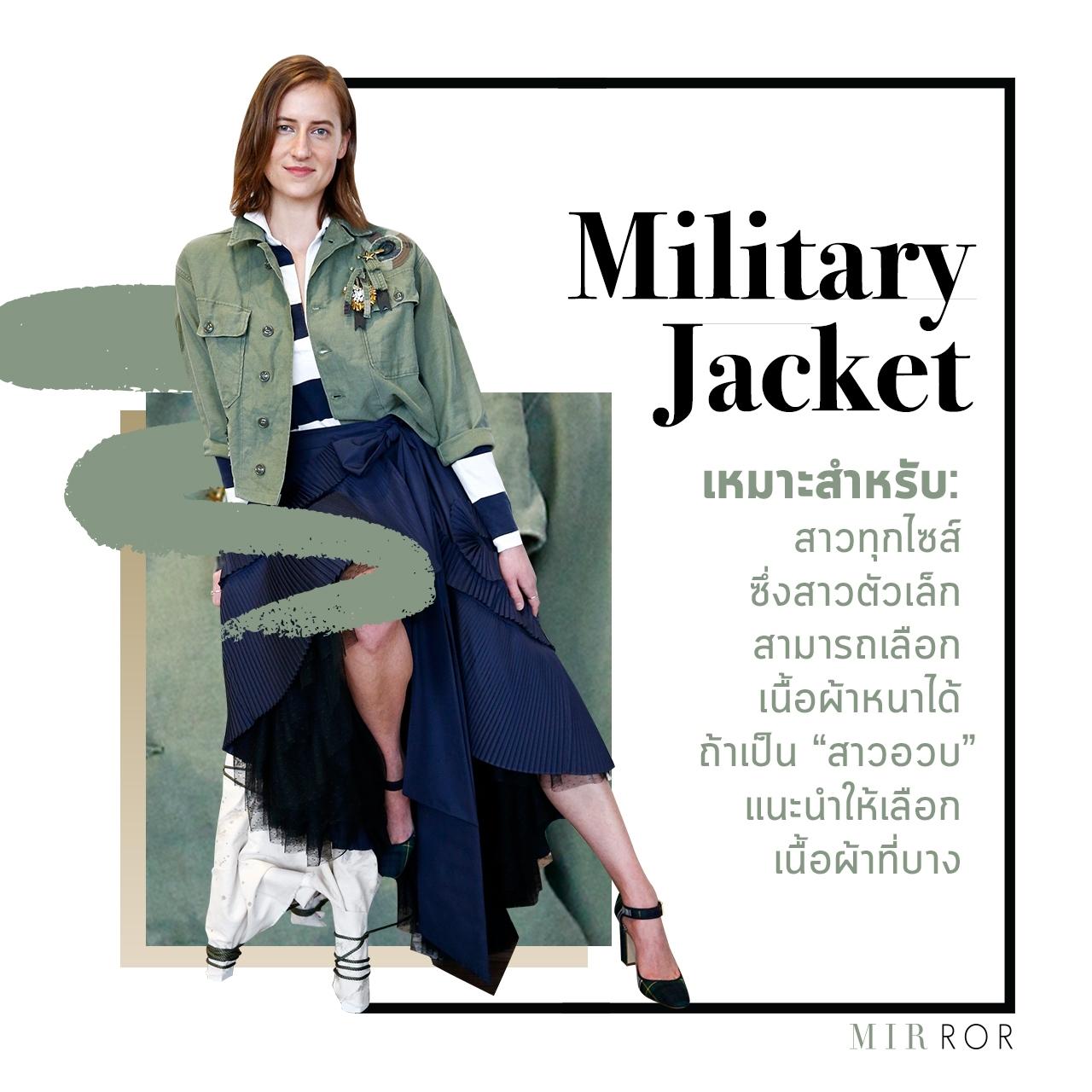 แจ็กเกตโทนสีทหาร อย่าง สีเขียวขี้ม้า ตัวช่วยในการเปลี่ยนสไตล์การแต่งตัวของคุณให้ดูมีสีสันมากขึ้น เป็นแจ็กเกตอีกหนึ่งตัวที่ MIRROR ยืนยันว่าสามารถแมตช์กับเสื้อผ้าได้หลายสไตล์ตั้งแต่ชุดทำงาน ชุดออกเดท ไปจนถึงวันสบายๆ หรือ วันที่ต้องเดินทางทั้งแบบผจญภัยและแบบสวยงาม