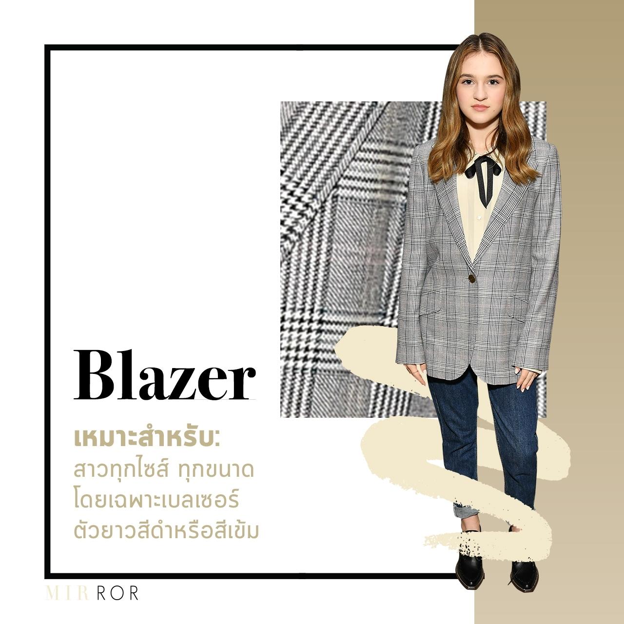 เหมาะสำหรับ : สาวทุกไซส์ทุกขนาดโดยเฉพาะเบลเซอร์ตัวยาวสีดำหรือสีเข้ม แนะนำให้เลือกแบบคลุมสะโพกลงมาประมาณต้นขานะคะ ช่วยอำพรางสัดส่วนได้ หยิบมาใส่เมื่อไหร่ก็ดูเพรียวขึ้นเสมอ