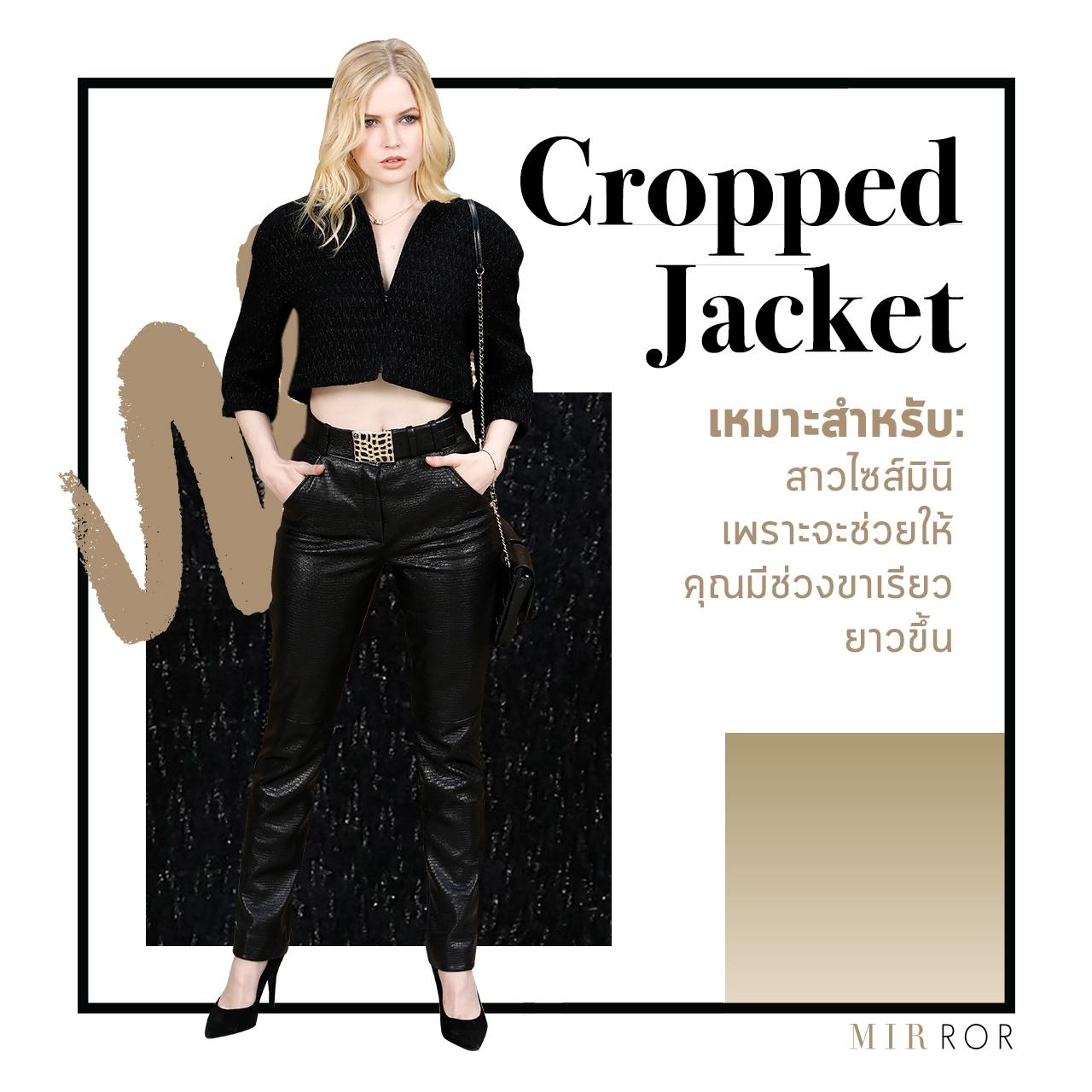 แจ็กเกตตัวสั้นเป็นแจ็กเกตที่ทำให้ผู้หญิงดูกระชับและหุ่นดีขึ้น ที่สำคัญคือดู "ขายาว" ขึ้นอย่างชัดเจน แจ็กเกตสไตล์นี้สามารถนำไปแมตช์กับกระโปรงสั้นทรงสอบเพื่อเป็นการ "แต่งตัวไปทำงาน" อีกลุคหนึ่งได้ ส่วนถ้าใครอยากซ่าหน่อย (และมั่นใจว่าขาสวย) ให้ใส่กับกางเกงเลคกิ้งไปเลย รับรอบว่า "แซ่บ" ค่ะ