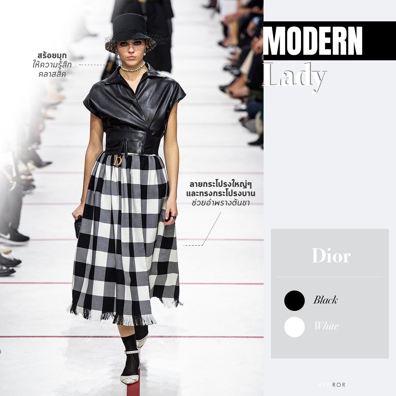 MIRROR picks : นี่คือการแต่งตัวที่จะทำให้ผู้หญิงดูสวยสง่าที่สุด MIRROR ชอบที่ดิออร์เอาลุควินเทจมาทำให้เก๋ขึ้นด้วยการใส่เสื้อหนังแทนเสื้อเชิ้ต ส่วนกระโปรงก็มีลูกเล่นเป็นเชิงรุ่ยๆ ทำให้ผู้หญิงดูเหมือนจะเรียบร้อยแบบมีเซอร์ไพรส์ เหมาะกับผู้หญิงยุคใหม่ที่ชอบความเรียบโก้แต่ไม่ดูเชย ที่สำคัญคือกระโปรงทรงนี้และลายพิมพ์ใหญ่สามารถช่วย "อำพรางหน้าท้อง" และต้นขาได้ดีมาก ไม่ต้องคอยแขม่วเพราะลายจะดึงความสนใจให้สายตาของคนไม่เพ่งไปที่หน้าท้องของคุณ มั่นใจได้เลย
