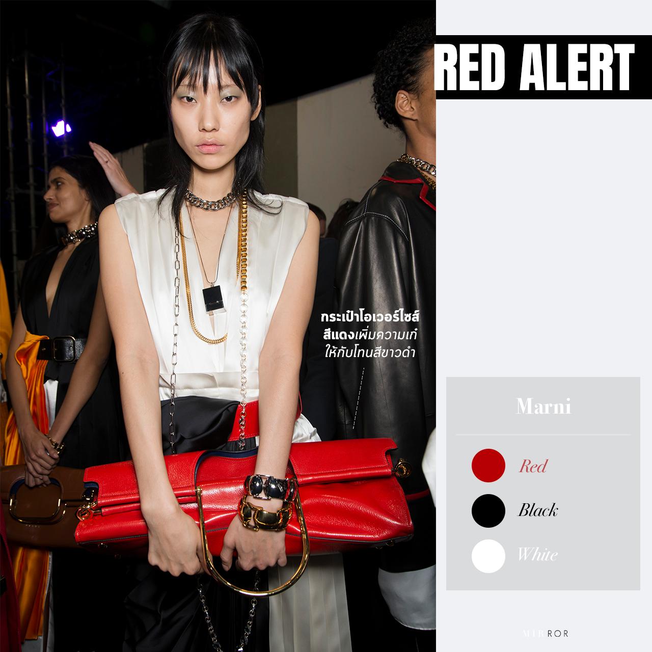 Look#8 : ใส่เสื้อผ้าสีขาวดำกับเครื่องประดับสีแดงสดและทองอร่าม จาก "Marni"