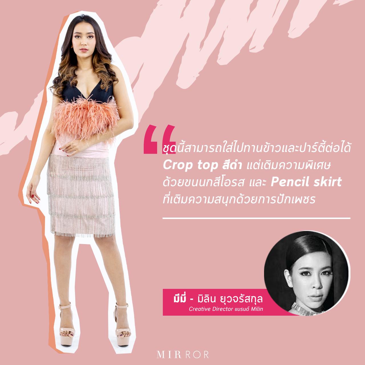 Milin recommend : "คอลเลกชั่น She's a ten ที่สามารถสวมใส่ไปรับประทานอาหาร และปาร์ตี้ต่อได้ในวันเดียว ท่อนบนเป็น Coptop สีดำ สีที่บางคนอาจจะไม่ได้คิดหรือมองข้ามไปสำหรับวันวาเลนไทน์ แต่เพิ่มความพิเศษด้วยการตกแต่งขนนกโทนสีโอลด์โรส แมตช์กับ "กระโปรงทรงสอบ" ที่เติมความสนุกโดยการปักเพชรทั้งตัว เวลาเคลื่อนไหวมันจะเพิ่มความสนุกให้กับผู้สวมใส่ได้มากยิ่งขึ้น"