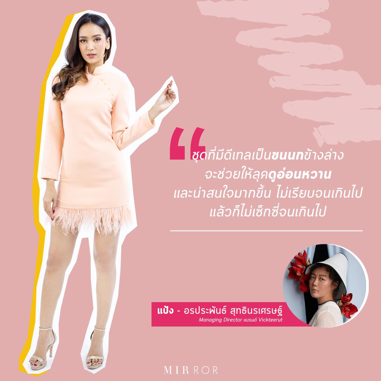 Vickteerut recommend : ดีไซเนอร์สาวสุดชิคแนะนำผ่านทีมงาน MIRROR สำหรับวาเลนไทน์ลุคปีนี้ไว้ว่า "เนื่องจากว่าวันวาเลนไทน์ ผู้หญิงส่วนใหญ่ไม่ว่าจะไปคนเดียว ไปหาคู่ ไปกับเพื่อน หรือจะไปทำกิจกรรมอะไรก็แล้วแต่ แน่นอนว่าเขาต้องการความโดดเด่น และเป็นที่สนใจ แต่ในขณะเดียวกันก็ต้องการความอ่อนหวานสักเล็กน้อยด้วยเหมือนกัน การเลือกชุดเดรสตัวนี้ ที่ด้านบนดูแข็งๆ เป็นเทรนเลอร์ แต่ข้างล่างอ่อนหวานด้วยดีเทลเป็นขนนก ไม่ว่าเธอจะลุก จะนั่ง หรือเต้น ขนนกจะส่งให้เธอดูมีความน่าสนใจมากยิ่งขึ้น แบบไม่ได้แข็งไปซะทีเดียว แล้วก็ไม่ได้เซ็กซี่จนเกินไป"