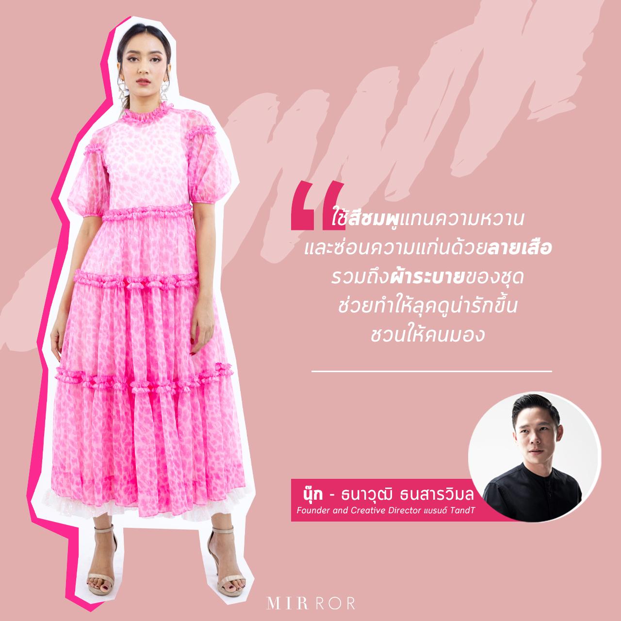 TandT recommend : อาจจะด้วยคาแรกเตอร์ผู้หญิง TandT ที่ชอบสนุกสนานกับการแต่งตัว ลุคนี้จึงเป็นลุคแนะนำจากดีไซเนอร์หนุ่มเพียงหนึ่งเดียวของ MIRROR "การใส่เดรสตัวหนึ่ง สามารถเลือกแมตช์ได้หลากหลาย เช่น แมตช์กับรองเท้าผ้าใบ มันก็ทำให้ลุคธรรมดาๆ กลายเป็นความพิเศษมากขึ้น อย่าง ชุดเดรสลายเสือสีชมพูตัวนี้ ความหวานที่แสดงออกมาก็คือสีชมพู แต่เราก็ซ่อนความแก่นไว้ตรงลายเสือ บวกกับลักษณะผ้าแบบพองๆ ระบายๆ ที่เพิ่มความน่ารัก ชวนให้แบบแฟนมองแล้วเอ่ยปากชม"