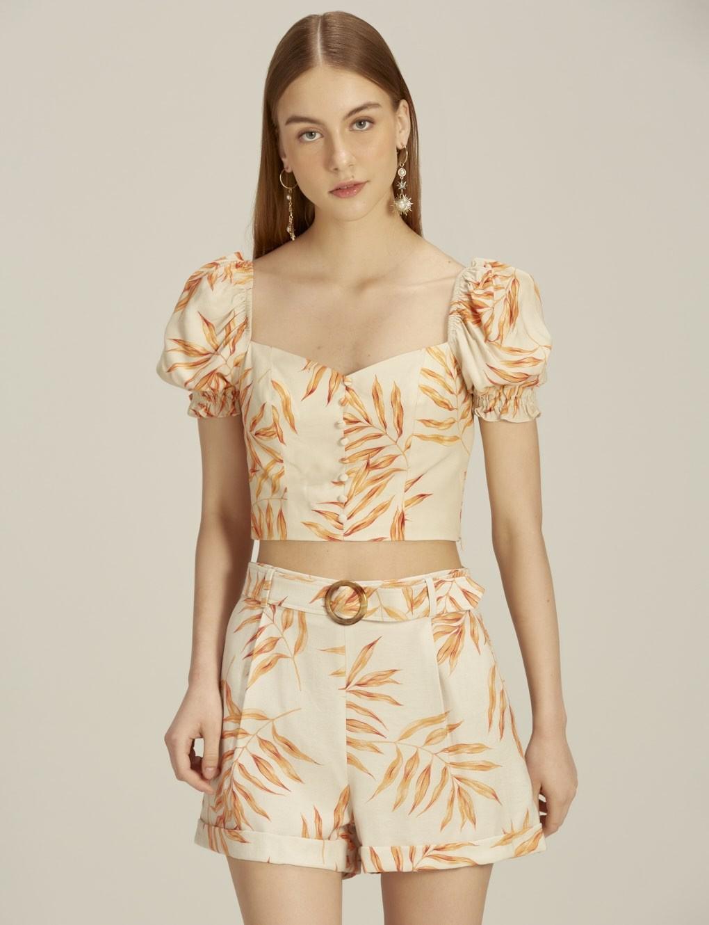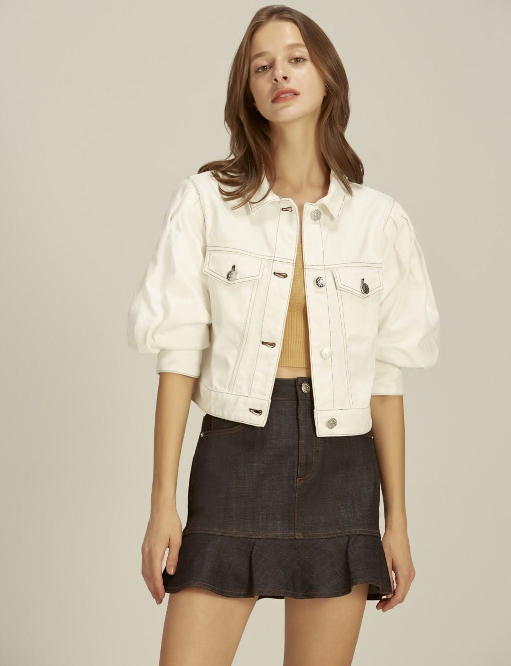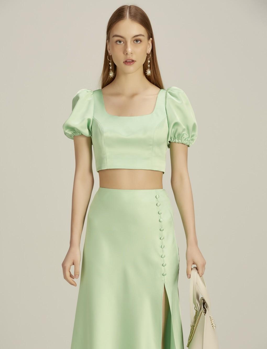 เสื้อครอปสีเขียวพาสเทล เพิ่มดีเทลแขนพองแบบตุ๊กตา ที่เมื่อสวมใส่แล้วให้ทั้งความรู้สึกสบายและเซ็กซี่ในเวลาเดียวกัน