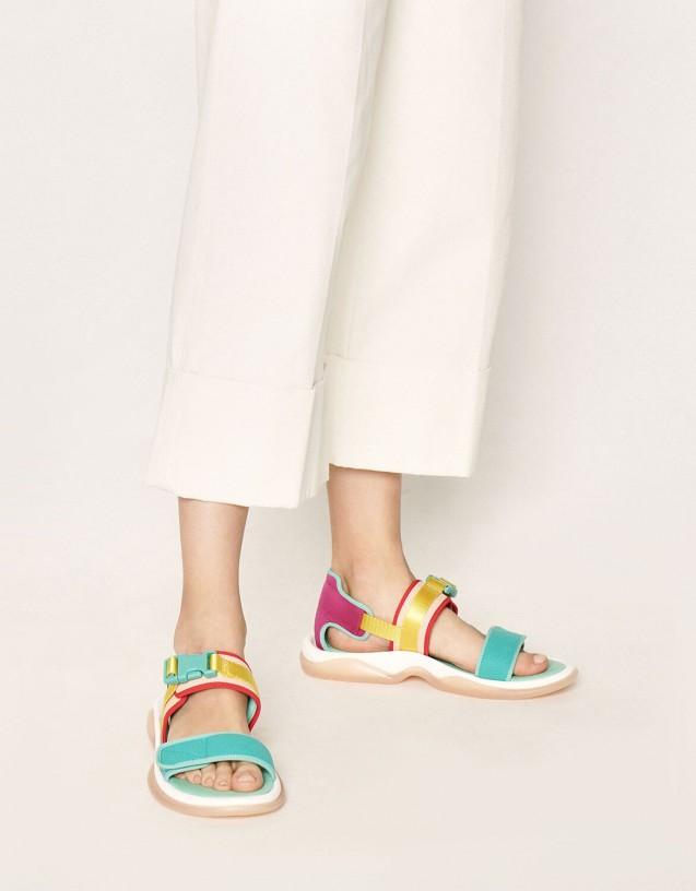 รองเท้าแซนดัลที่โดดเด่นด้วยสีสันอันสดใส กับความสูงของส้นที่ 4 ซม. คู่นี้ จะช่วยทำให้ลุคของคุณทั้งดูคล่องตัวและสะดวกสบาย แต่ถ้าคุณอยากสร้างกิมมิกให้กับตัวเอง การเติมถุงเท้าสีสันสดใสเข้าไปอีกสักคู่ ก็ดูชิคและเก๋ไม่น้อยเลยทีเดียวค่ะ