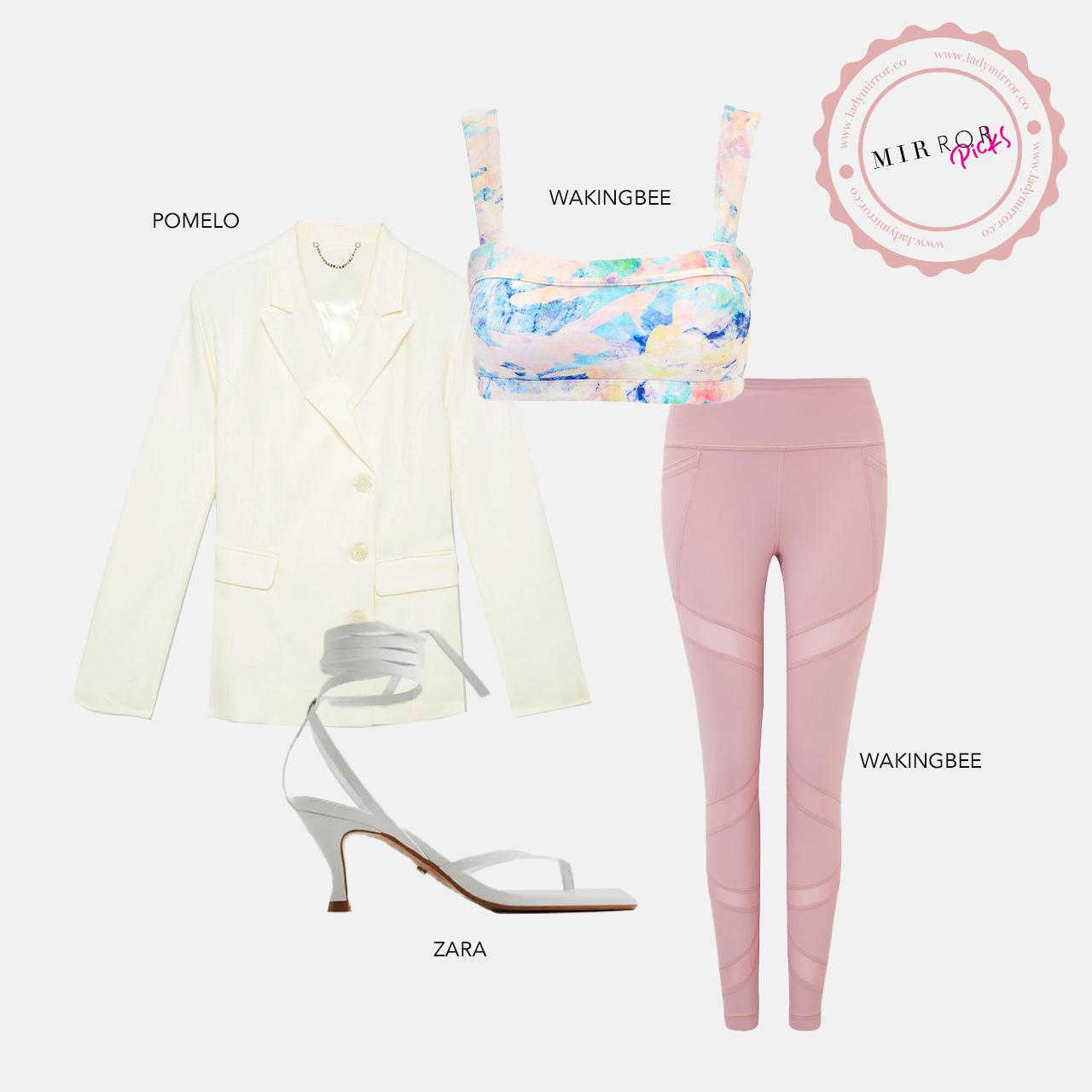โทนสีขาวแบบผู้ดีช่วยให้วันทำงานดูรีแลกซ์ขึ้น แต่ไม่ลืมเพิ่มสีสันให้กับการแต่งตัวด้วยบราพิมพ์ลาย และเลกกิ้งขายาวเข้ารูปสีชมพู ปิดท้ายด้วยรองเท้าส้นสูงพร้อมเดินทางต่อเพื่อปาร์ตี้