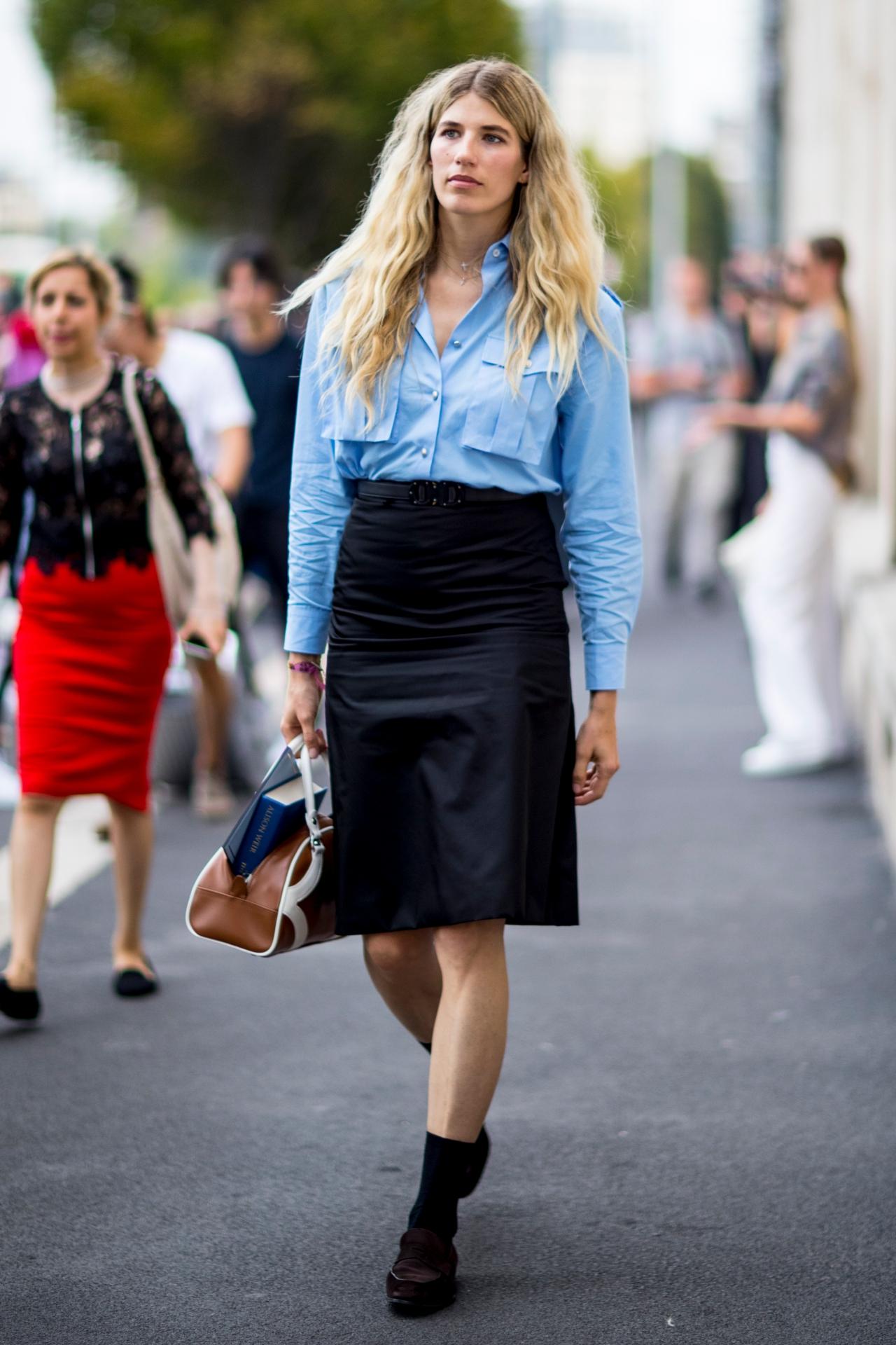 MIRROR Tips : เสื้อเชิ้ตแขนยาวสีฟ้า นำมาแมตช์กับกระโปรงทรงตรงคลุมเข่าสีเข้ม สไตล์ลิ่งนี้คือลุคทำงานธรรมดาสุดเบสิกที่ผู้หญิงไทยทุกไซส์สามารถสวมใส่ได้