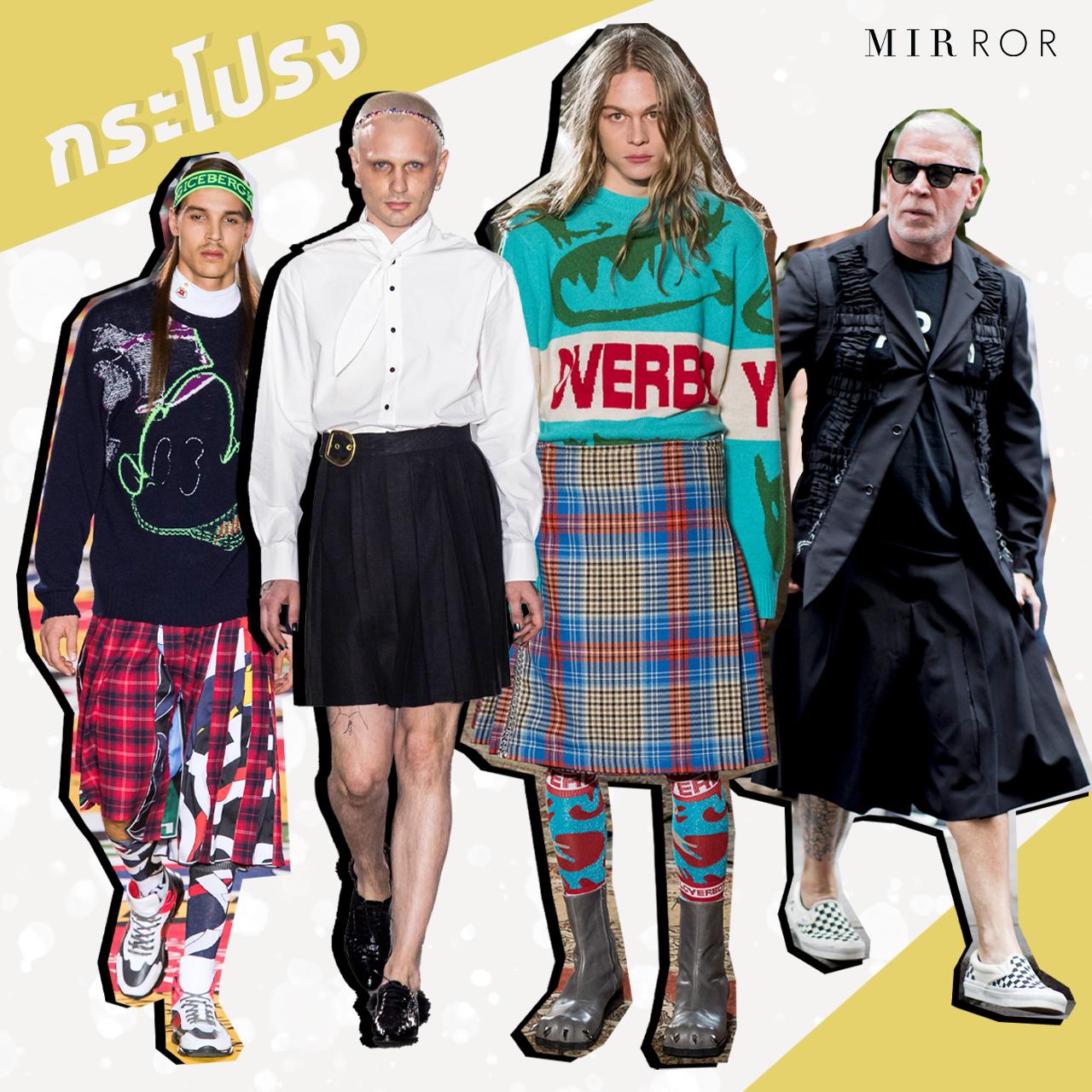 เทรนด์ "ผู้ชายสวมใส่กระโปรง" ยังไม่ได้เป็นกระแส และได้รับความนิยมเท่ากับ "ผู้ชายทำเล็บ" ก็จริง แต่ใช่ว่าจะไม่มีเลยนะคะ MIRROR ขอย้อนกลับไปเมื่อฤดูกาล Fall/Winter 2019/2020 ที่ London Fashion Week Men's เหล่านักออกแบบต่างสร้างปรากฏการณ์ให้กับโลกของแฟชั่นอีกครั้ง ด้วยการปรับเปลี่ยนไอเทมท่อนล่างของผู้ชายจากกางเกงเป็นประโปรงนั่นเอง แน่นอนว่ามันดูแปลกใหม่มากๆ หากเทียบกับความคุ้นชินที่ผ่านๆ มา และถึงแม้ว่าเทรนด์นี้จะยังไม่ได้รับความนิยมอย่างแพร่หลายในประเทศไทย เพราะอาจจะดูแปลกๆ กับค่านิยมที่มี แต่ดูไว้เป็นแนวทางสนุกๆ ก็ถือว่าเป็นไอเดียที่ฉีกกรอบไปได้ไกลทีเดียวค่ะ