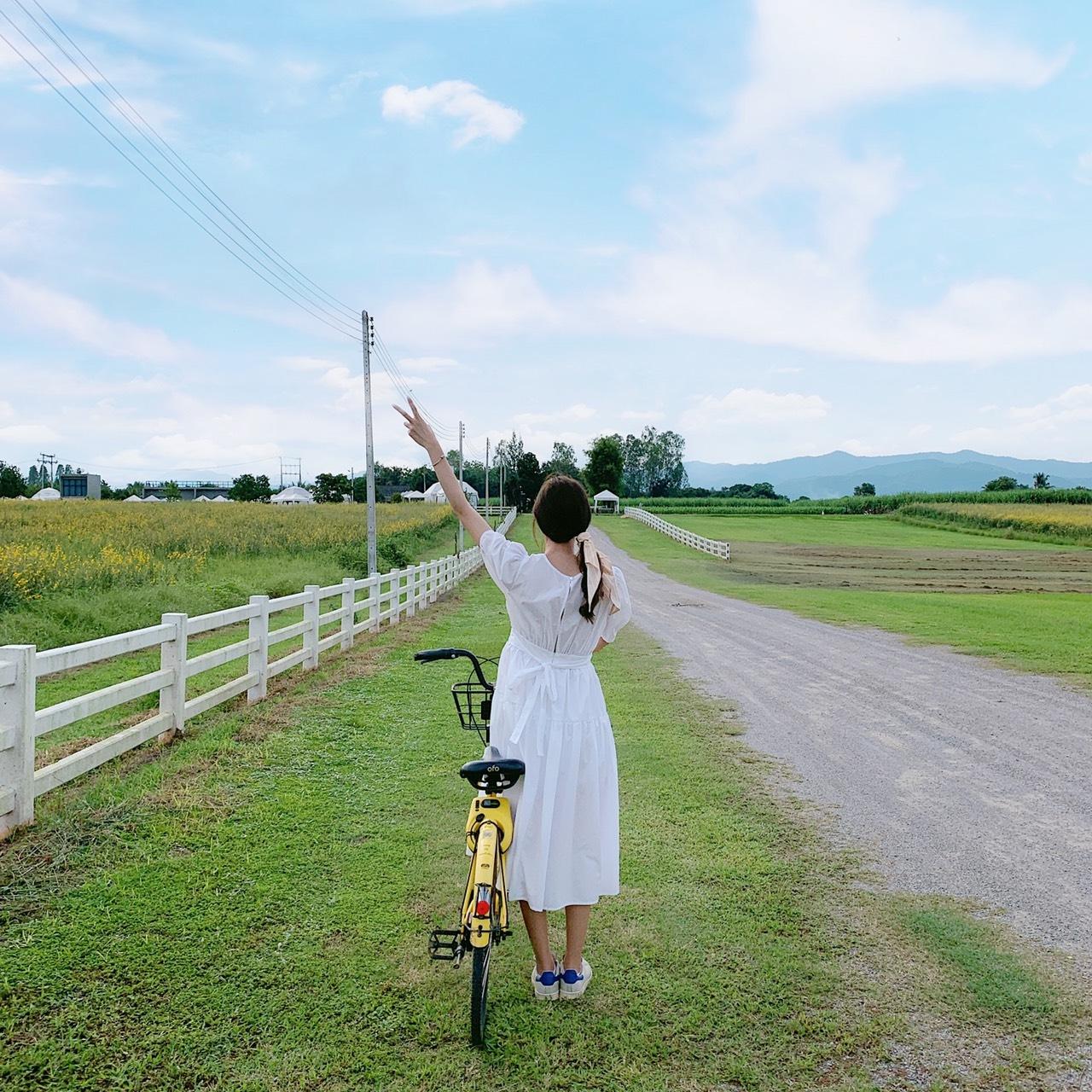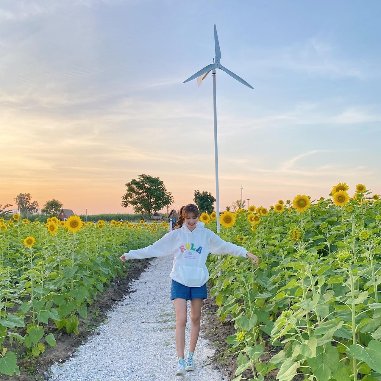 สวมใส่เสื้อผ้าสีตัดกับทุ่งดอกไม้ ภาพนี้เน้นถ่ายมุมสูง ส่วนนางแบบก็โพสท่าน่ารักๆ สดใส ยิ้มแย้ม คล้ายกับวิ่งเล่นอยู่ในทุ่งดอกไม้ได้เลยค่ะ แต่ถ้าไม่มีกล้องโดรน หรือสถานที่ที่ให้ปีนขึ้นไปเพื่อถ่ายมุมสูงได้ ก็เน้นเป็นการถ่ายภาพแบบโคลสอัพใกล้ๆ กับดอกไม้แทนได้เหมือนกันค่ะ น่ารักไปอีกแบบ