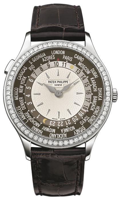 3. รุ่น Ref : 7130 WG ( Ladies’ World Time ) เป็นนาฬิกา Complications ซึ่งเป็นนาฬิกา World Time สุภาพสตรีรุ่นแรก เปิดตัวมาในปี 2011 ตัวเรือนเป็น White Gold โดยใช้ Ref : ของรุ่นคือ 7130 WG กลไกเป็น Self Winding Movement แบบบางเฉียบ Caliber 240 HU แสดงเวลา 24 Time Zone สามารถมองเห็นกลไกของเครื่องผ่านกระจกฝาหลัง Sapphire Crystal ลักษณะของนาฬิการุ่นนี้คือ ตัวเรือนขนาด 36 มม. ขอบตัวเรือนประดับเพชร 62 เม็ดหรือประมาณ 0.82 กะรัต Pin Buckle เป็น White Gold ขนาด 14 มม. ประดับเพชร 27 เม็ดหรือประมาณ 0.21 กะรัต หน้าปัดเป็นสี Ivory (สีขาวนวลๆ) ตรงกลางของหน้าปัดมีความประณีตและสวยงามด้วยลวดลาย Guilloche Ref : 7130 WG เป็นนาฬิกา World Time ที่ดีไซน์แบบร่วมสมัยและสวยงามด้วยการตกแต่งด้วยเพชรรวมทั้งหมด 1.03 กะรัต ที่อยู่บนขอบตัวเรือนและ Pin Buckle การเปิดตัวของรุ่น 7130 WG ทำให้นาฬิกาในกลุ่มของ World Time สมบูรณ์แบบยิ่งขึ้น โดยที่ก่อนหน้านี้เรามีนาฬิกา world time ของผู้ชายรุ่น 5130 ตัวเรือน RG และ WG ซึ่งออกตัวมาในปี 2006 และต่อมาในปี 2007 ได้ออกตัวในตัวเรือน Platinum