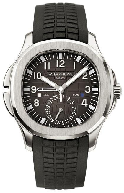 2. รุ่น 5164 A (Aquanaut Travelv) ฟังก์ชั่นตัวเรือน steel ออกตัวมาในปีนี้โดยใช้ Ref ของรุ่นคือ 5164 A กลไกแบบ Self Winding Caliber ใหม่ 324 SC FUS ซึ่งผลิตและพัฒนาภายใต้กฎของ PP seal และ Spiromax Balance Spring ขนาดตัวเรือน 40.8 มม. โดยวัดจาก 10-4 นาฬิกา ขนาดจะเท่ากับ Aquanaut รุ่น 5167 ลักษณะของรุ่นนี้ คือ บอกเวลา 2 โซน คือ Home Time และ Local Time มีช่องแสดงเวลากลางวันและกลางคืน 2 ช่องสำหรับ Home Time และ Local Time แต่เราจะตั้งเวลาที่เป็นเวลากลางวันกลางคืนเฉพาะกับเวลาที่เป็น local เท่านั้น เพื่อให้แน่ใจว่าวันที่เปลี่ยนตามเวลาเที่ยงคืนของ Local Time นาฬิกาใช้งานง่ายด้วยปุ่มกด 2 ปุ่มข้างตัวเรือน ทำให้เข็มชั่วโมงเคลื่อนไปข้างหน้าโดยใช้ปุ่มที่ 8 นาฬิกา และถ้าให้เข็มเคลื่อนกลับหลังโดยใช้ปุ่มที่ 10 นาฬิกา ในกรณีที่ไม่เดินไปใหน เข็มชั่วโมง 2 เข็มนี้ก็จะซ้อนกันและเดินไปพร้อมๆกัน