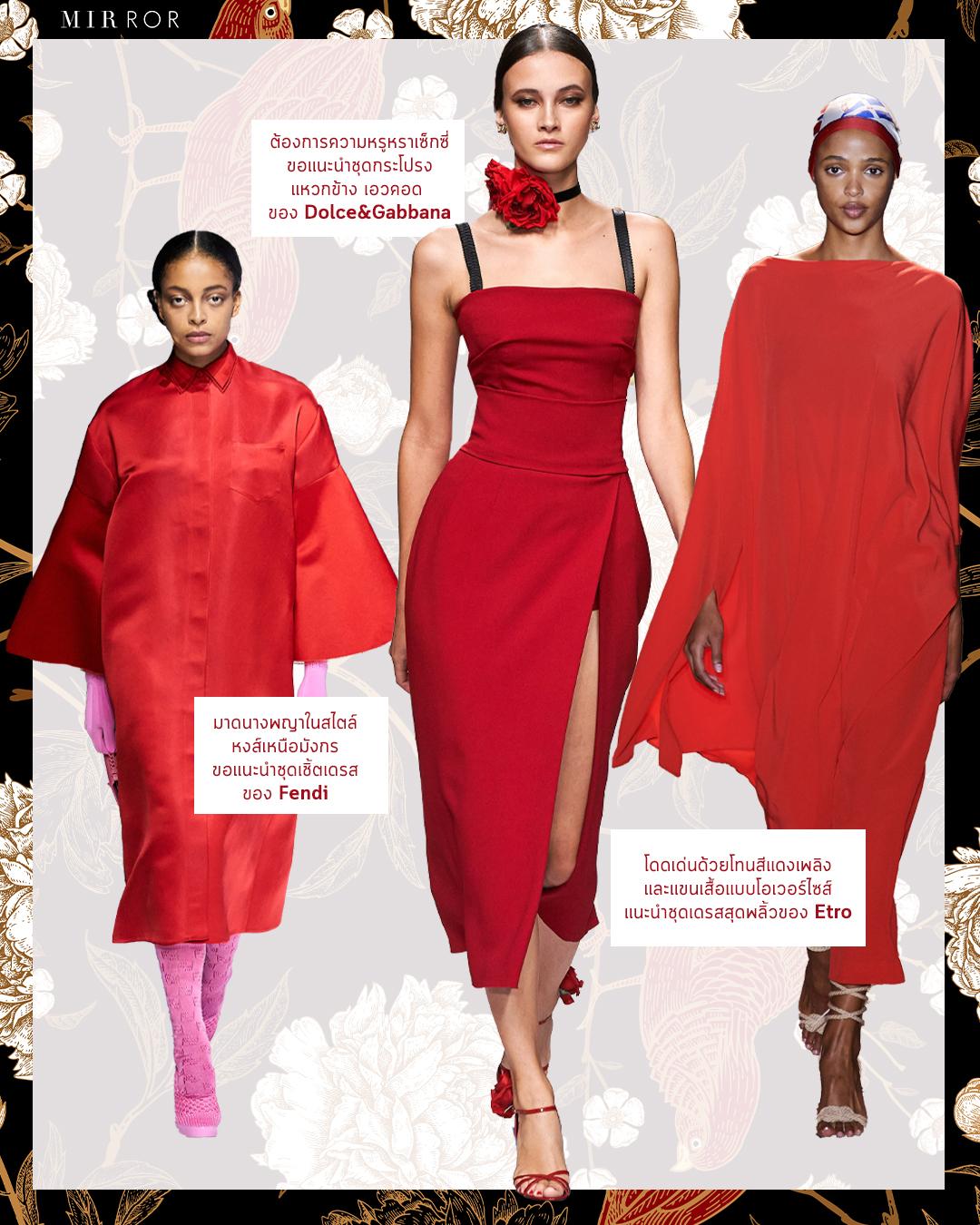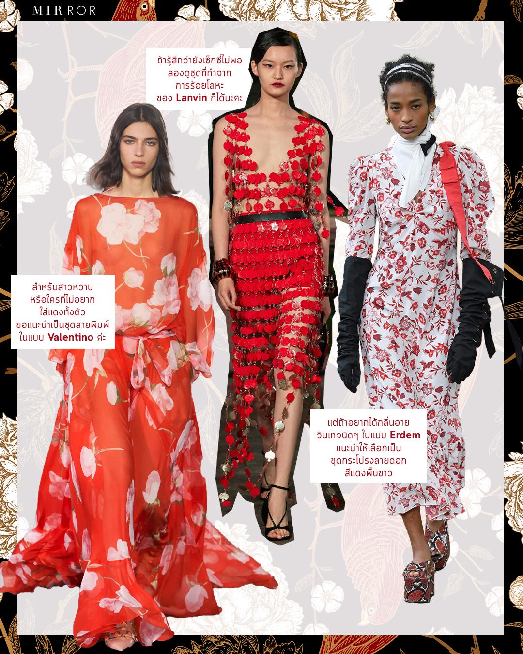 สำหรับสาวหวาน หรือใครที่ไม่อยากใส่แดงทั้งตัว ขอแนะนำเป็นชุดลายพิมพ์ ทั้งชุดกระโปรงลายพิมพ์ดอกกุหลาบผ้าชีฟองสุดพลิ้วในแบบ Valentino หรือถ้ายังดูแดงมากไป ก็อาจจะเป็นชุดกระโปรงลายดอกสีแดงพื้นขาวมีกลิ่นอายวินเทจนิดๆ ในแบบ Erdem