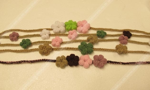 4.นำดอกไม้ที่ถักเสร็จแล้วไปถักหรือผูกเข้ากับเส้นเชือกที่ถักไว้ตอนแรก และเก็บความเรียบร้อย