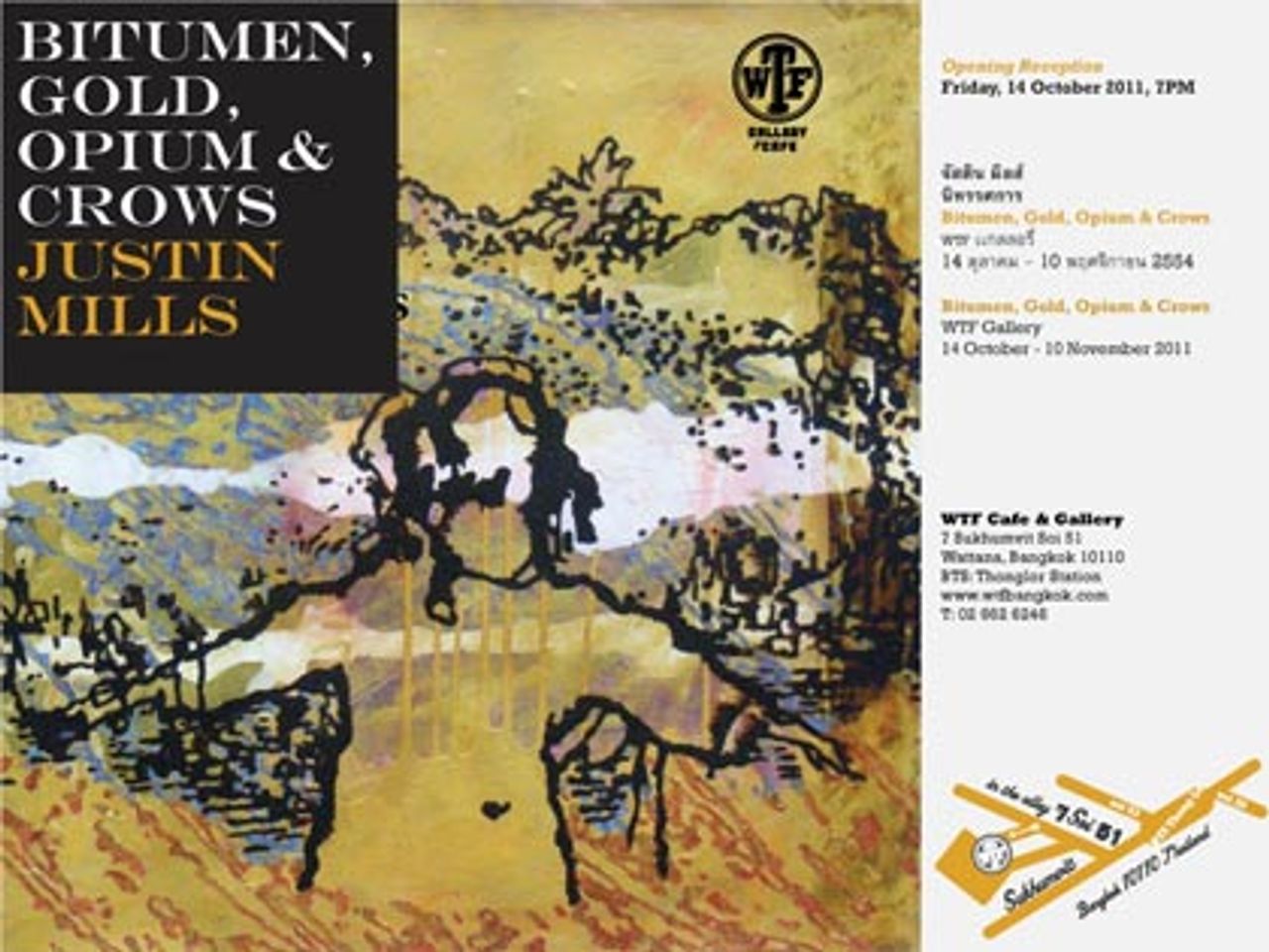 WTF Gallery ภูมิใจเสนองานนิทรรศการภาพวาด Bitumen, Gold, Opium & Crows โดยศิลปินชาวอังกฤษ จัสติน มิลส์ สำหรับประวัติ เขาเกิดที่ประเทศอังกฤษ และทำงานอยู่ที่กรุงเทพฯ ตั้งแต่ปี 1996 เรียนจบจากมหาวิทยาลัยบริสตอลที่อังกฤษ และเรียนต่อระดับปริญญาโทด้านวิจิตรศิลป์ ที่มหาวิทยาลัย Visva-Bharati (Santiniketan) ในปี 1994 จัสตินเคยจัดแสดงงานมาแล้วในหลายประเทศ อย่างเช่น งาน ‘A Brief View of Everything’ จัดแสดงที่หอศิลป์ จุฬาลงกรณ์มหาวิทยาลัย ในปี 2010 งานแสดงภาพพิมพ์และวาดเส้นนานาชาติ ครั้งที่ 2 ที่หอศิลปวัฒนธรรมแห่งกรุงเทพมหานคร ในปี 2009 งาน ‘Brahma to Bapu’ ที่ Visual Art Gallery ในเมืองนิวเดลี ประเทศอินเดีย ซึ่ง curate โดย Rakhi Sarkar ในปี 2002 และงานจัดวางที่เป็นการทำงานร่วมกันของศิลปินหลายคนที่ Outpost Venice Biennale ในเมืองเวนิส เมื่อปี 1995