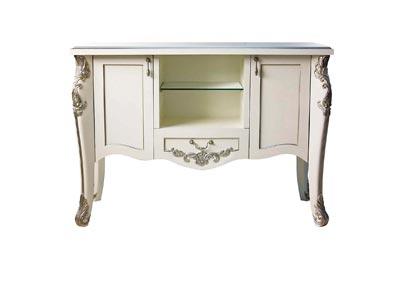 ตู้ลิ้นชักขาทึบสไตล์ย้อนยุคสีขาวขัดเสี้ยนตัวนี้ มีความยาวเกือบ 2 เมตร จึงมีพื้นที่วางของได้มาก แต่ก็มีข้อเสีย ถ้าจัดวางของบนท็อปตู้ไม่ดีก็จะทำให้เหลือพื้นที่ว่างมากเกินไป หรือถ้าวางของมากเกินก็อาจทำให้มุมนี้ดูทึบตันได้ในทันทีเช่นกัน ถ้าคุณอยากให้มุมนี้ดูเด่นสะดุดตา เราแนะนำให้ใช้ของตกแต่งประเภทตุ๊กตาหรือรูปปั้นที่มีรูปทรงฟรีฟอร์มสไตล์แอนทีคมาจัดวางเพื่อให้ดูเข้ากับตัวตู้ รูปทรงฟรีฟอร์มจะช่วยให้ของแต่ละชิ้นดูเชื่อมต่อกัน และช่วยให้ตู้ที่มีรูปทรงสี่เหลี่ยมดูนุ่มนวลอ่อนหวานขึ้น